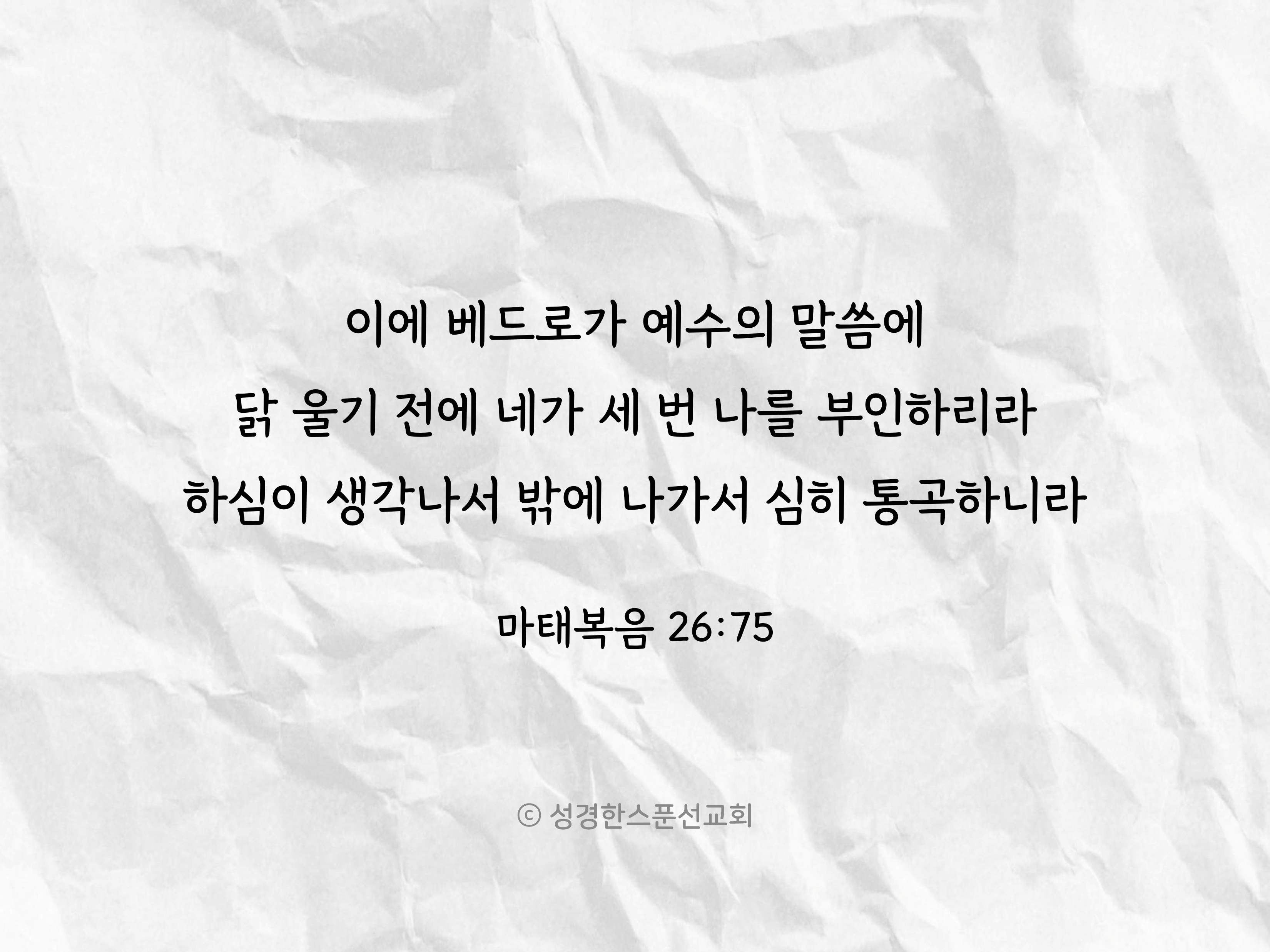 🔅오늘의 성경 한스푼/말씀카드 이에 베드로가 예수의 말씀에 닭 울기 전에 네가 세 번 나를 부인하리라 하심에 생각나서 밖에 나가서 심히 통곡하니라 bibleonespoon 2023. 4. 4. 08:14 핸드폰 배경화면, SNS 프로필 사진, 암송카드 등 개인적인 용도로는 자유롭게 활용하셔도 좋습니다. (2-3초간 꾹 누르시면 이미지 저장이 가능합니다♡) 공유하기 게시글 관리 성경한스푼선교회 '🔅오늘의 성경 한스푼/말씀카드' Related Articles 총독이 물어 가로되 네가 유대인의 왕이냐 예수께서 대답하시되 네 말이 옳도다 하시고 유다가 은을 성소에 던져 놓고 물러가서 스스로 목매어 죽은지라 시험에 들지 않게 깨어 있어 기도하라 마음에는 원이로되 육신이 약하도 인자가 십자가에 못 박히기 위하여 팔리우리라 하시더라