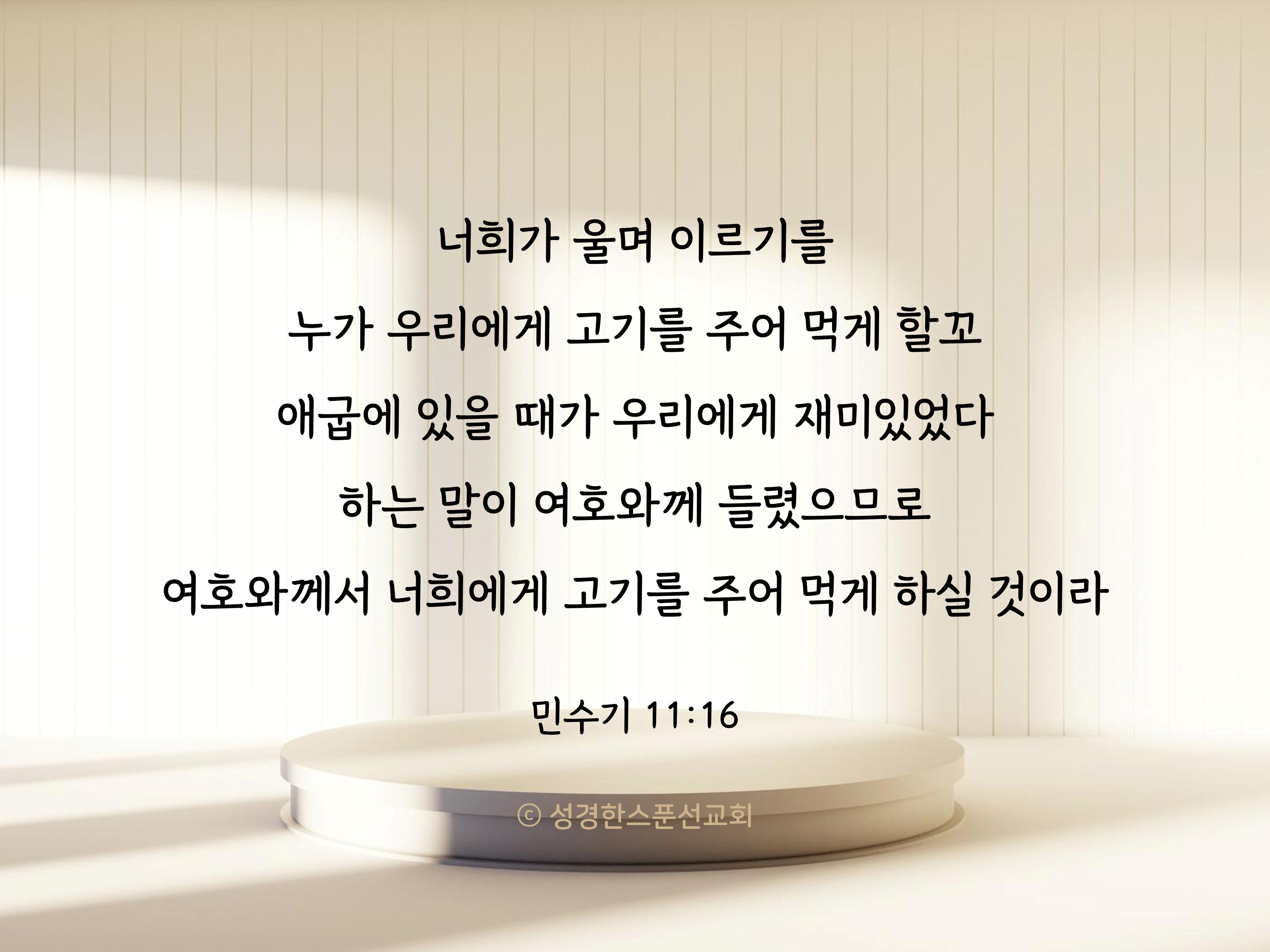 🔅오늘의 성경 한스푼/말씀카드 애굽에 있을 때가 우리에게 재미있었다 하는 말이 여호와께 들렸으므 bibleonespoon 2023. 4. 11. 08:07 핸드폰 배경화면, SNS 프로필 사진, 암송카드 등 개인적인 용도로는 자유롭게 활용하셔도 좋습니다. (2-3초간 꾹 누르시면 이미지 저장이 가능합니다♡) 공유하기 게시글 관리 성경한스푼선교회 '🔅오늘의 성경 한스푼/말씀카드' Related Articles 여호와께서 모세에게 일러 가라사대 사람을 보내어 내가 이스라엘 자손에게 주는 가나안 땅을 탐지하게 하되 사람이 교만하면 낮아지게 되겠고 마음이 겸손하면 영예를 얻으리라 백성이 여호와의 들으시기에 악한 말로 원망하매 여호와께서 들으시고 진노하사 심히 두려워하여 가로되 이는 진실로 하나님의 아들이었도다 하더라