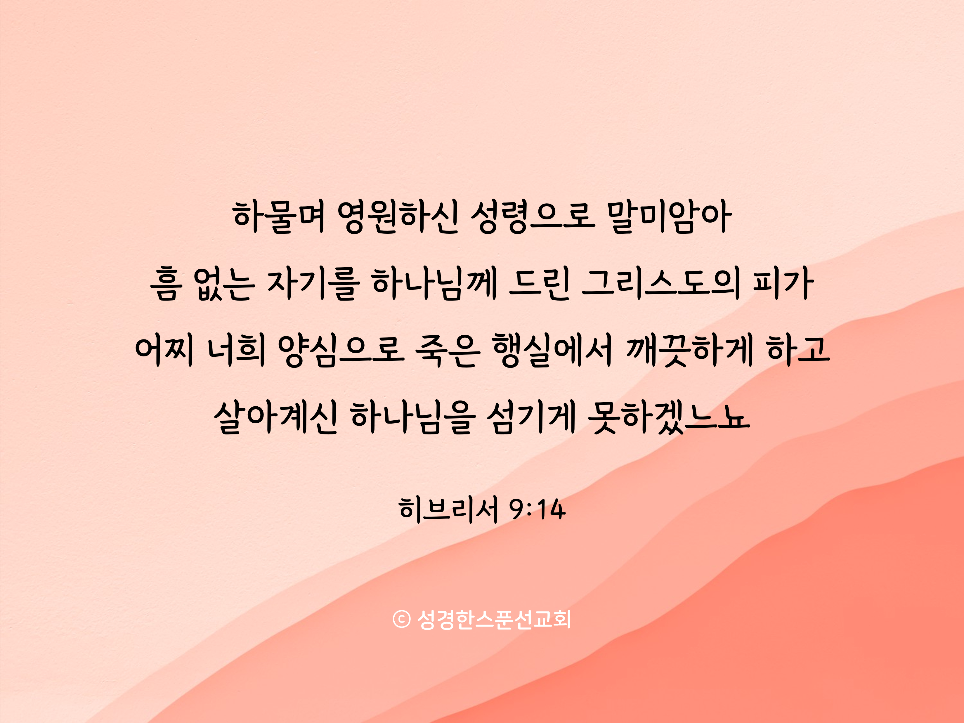 🔅오늘의 성경 한스푼/말씀카드 흠 없는 자기를 하나님께 드린 그리스도의 피가 어찌 너희 양심으로 죽은 행실에서 깨끗하게 하고 살아계신 하나님을 섬기게 못하겠느 bibleonespoon 2023. 4. 28. 08:18 핸드폰 배경화면, SNS 프로필 사진, 암송카드 등 개인적인 용도로는 자유롭게 활용하셔도 좋습니다. (2-3초간 꾹 누르시면 이미지 저장이 가능합니다♡) 공유하기 게시글 관리 성경한스푼선교회 '🔅오늘의 성경 한스푼/말씀카드' Related Articles 여호와께서 모세에게 이르시되 그를 두려워 말라 내가 그와 그 백성과 그 땅을 네 손에 붙였나니 모세가 놋뱀을 만들어 장대 위에 다니 뱀에게 물린 자가 놋뱀을 쳐다본즉 모두 살더라 이것은 이스라엘 자손 회중을 위하여 간직하였다가 부정을 깨끗하게 하는 물을 만드는데 쓸 것이니 곧 속죄제니라 너희의 받은 모든 예물 중에서 너희는 그 아름다운 것 곧 거룩하게 한 부분을 취하여 여호와께 거제로 드릴찌니라
