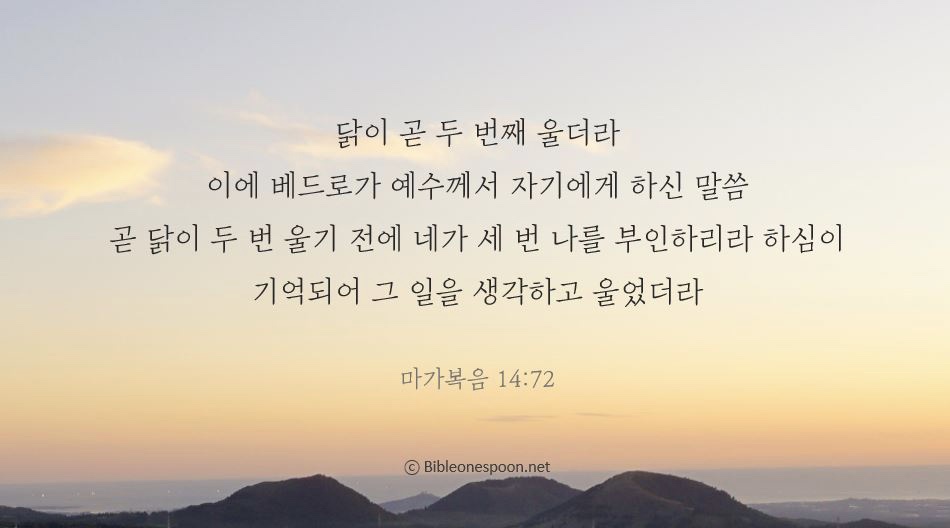 🔅오늘의 성경 한스푼/말씀카드 닭이 곧 두 번째 울더라 bibleonespoon 2020. 4. 10. 07:53 핸드폰 배경화면, SNS 프로필 사진, 암송카드 등 개인적인 용도로는 자유롭게 활용하셔도 좋습니다 ♡ 공유하기 게시글 관리 성경한스푼선교회 '🔅오늘의 성경 한스푼/말씀카드' Related Articles 아리마대 사람 요셉 이 사람은 진실로 빌라도가 무리에게 만족을 주고자하여 이 백성이