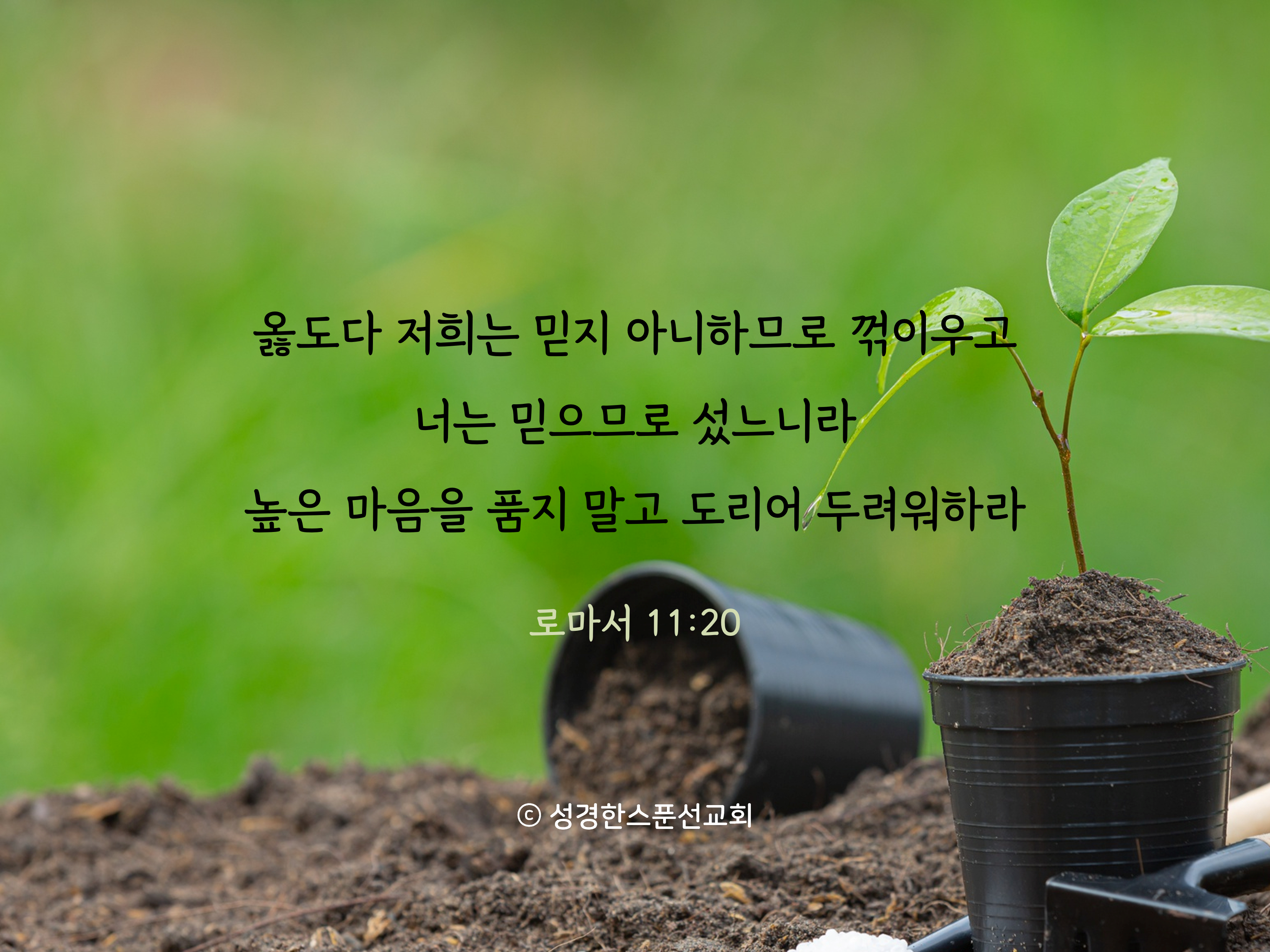 🔅오늘의 성경 한스푼/말씀카드 옳도다 저희는 믿지 아니하므로 꺾이우고 너는 믿으므로 섰느니라 높은 마음을 품지 말고 도리어 두려워하라 bibleonespoon 2023. 6. 19. 08:27 핸드폰 배경화면, SNS 프로필 사진, 암송카드 등 개인적인 용도로는 자유롭게 활용하셔도 좋습니다. (2-3초간 꾹 누르시면 이미지 저장이 가능합니다♡) 공유하기 게시글 관리 성경한스푼선교회 '🔅오늘의 성경 한스푼/말씀카드' Related Articles 하나님의 선하시고 기뻐하시고 온전하신 뜻이 무엇인지 분별하도록 하 하나님의 은사와 부르심에는 후회하심이 없느니 네가 만일 네 입으로 예수를 주로 시인하며 또 하나님께서 그를 죽은 자 가운데서 살리신 것을 네 마음에 믿으면 구원을 얻으리니 하나님의 의를 모르고 자기 의를 세우려고 힘써 하나님의 의에 복종하지 아니하였느니라