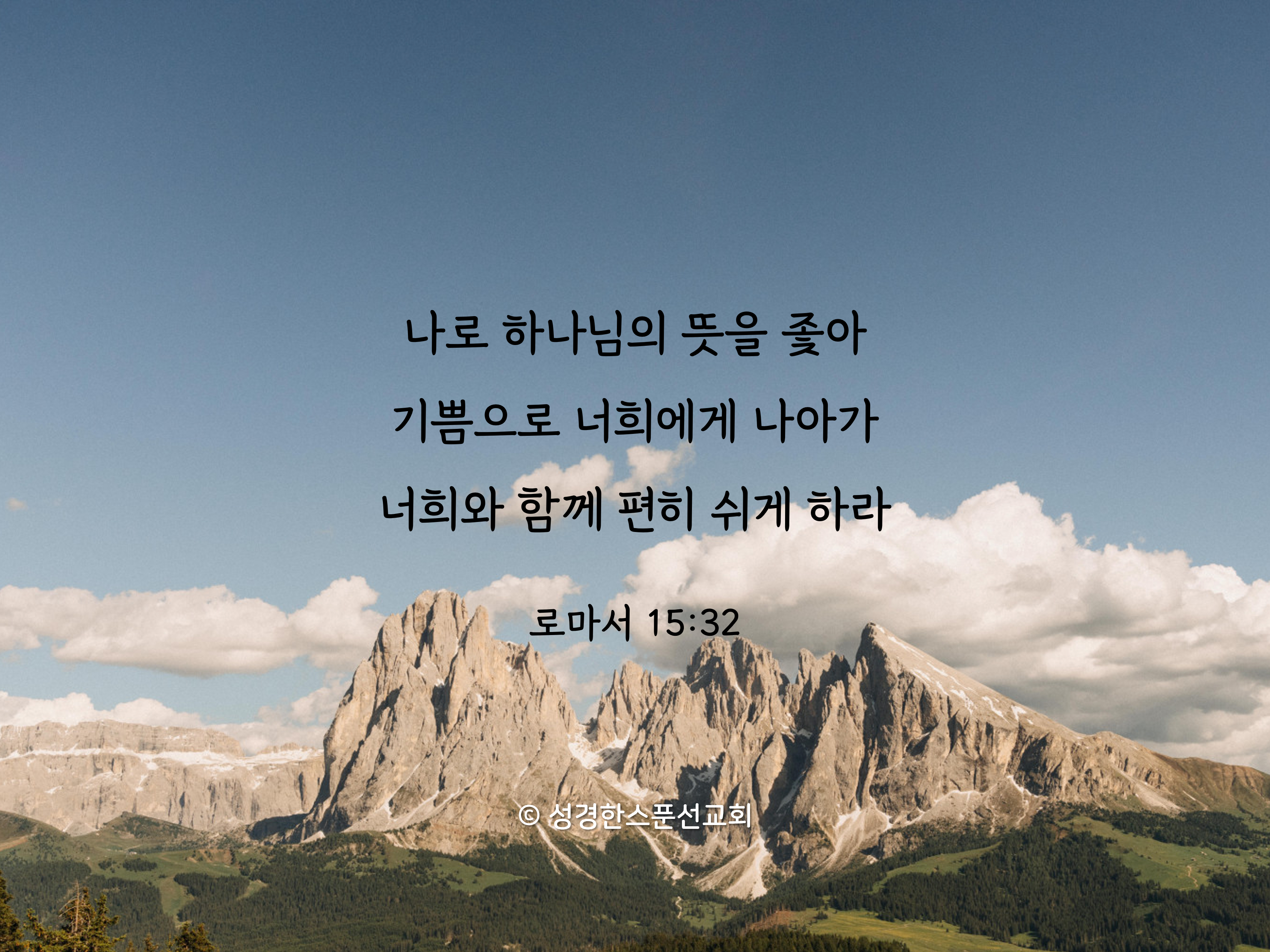 🔅오늘의 성경 한스푼/말씀카드 나로 하나님의 뜻을 좇아 기쁨으로 너희에게 나아가 너희와 함께 편히 쉬게 하라 bibleonespoon 2023. 6. 28. 08:31 핸드폰 배경화면, SNS 프로필 사진, 암송카드 등 개인적인 용도로는 자유롭게 활용하셔도 좋습니다. (2-3초간 꾹 누르시면 이미지 저장이 가능합니다♡) 공유하기 게시글 관리 성경한스푼선교회 '🔅오늘의 성경 한스푼/말씀카드' Related Articles 너희 순종함이 모든 사람에게 들리는지라 그러므로 내가 너희를 인하여 기뻐하노니 너희가 선한데 지혜롭고 악한데 미련하기를 원하노라 이와 같이 우리 많은 사람이 그리스도 안에서 한 몸이 되어 서로 지체가 되었느니라 주의 소식을 받지 못한 자들이 볼 것이요 듣지 못한 자들이 깨달으리 밤이 깊고 낮이 가까워졌으니 그러므로 우리가 어두움의 일을 벗고 빛의 갑옷을 입자