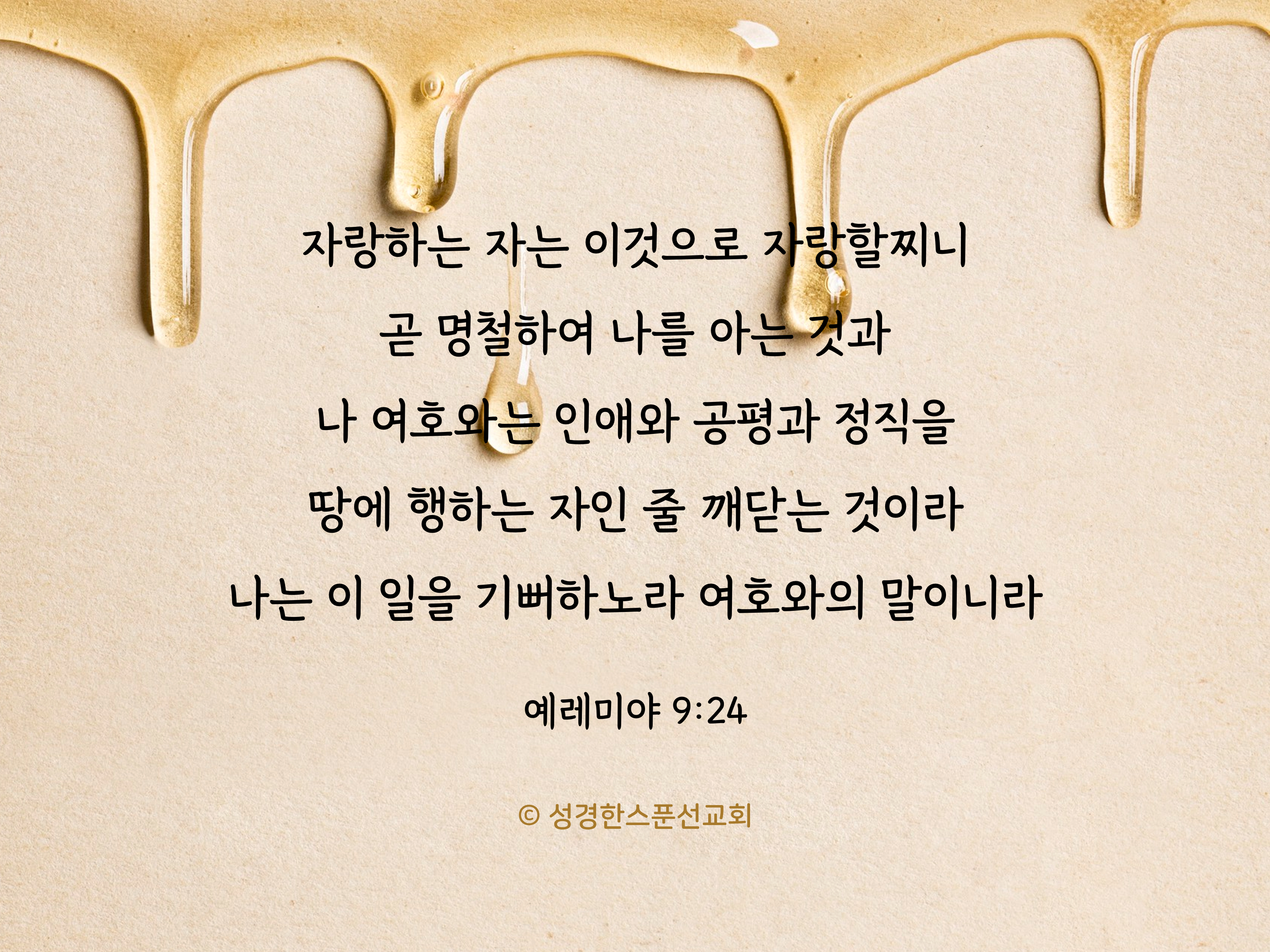 🔅오늘의 성경 한스푼/말씀카드 자랑하는 자는 이것으로 자랑할찌니 곧 명철하여 나를 아는 것과 나 여호와는 인애와 공평과 정직을 땅에 행하는 자인 줄 깨닫는 것이라 bibleonespoon 2023. 7. 26. 08:23 핸드폰 배경화면, SNS 프로필 사진, 암송카드 등 개인적인 용도로는 자유롭게 활용하셔도 좋습니다. (2-3초간 꾹 누르시면 이미지 저장이 가능합니다♡) 공유하기 게시글 관리 성경한스푼선교회 '🔅오늘의 성경 한스푼/말씀카드' Related Articles 여호와여 내가 알거니와 인생의 길이 자기에게 있지 아니하니 걸음을 지도함이 걷는 자에게 있지 아니하니이 여호와께서 그 권능으로 땅을 지으셨고 그 지혜로 세계를 세우셨고 그 명철로 하늘들을 펴셨으며 내 목소리를 청종치 아니하며 그대로 행치 아니하고 그 마음의 강퍅함을 따라 그 열조가 자기에게 가르친 바알들을 좇았음이라 공중의 학은 그 정한 시기를 알고 반구와 제비와 두루미는 그 올 때를 지키거늘 내 백성은 여호와의 규를 알지 못하도