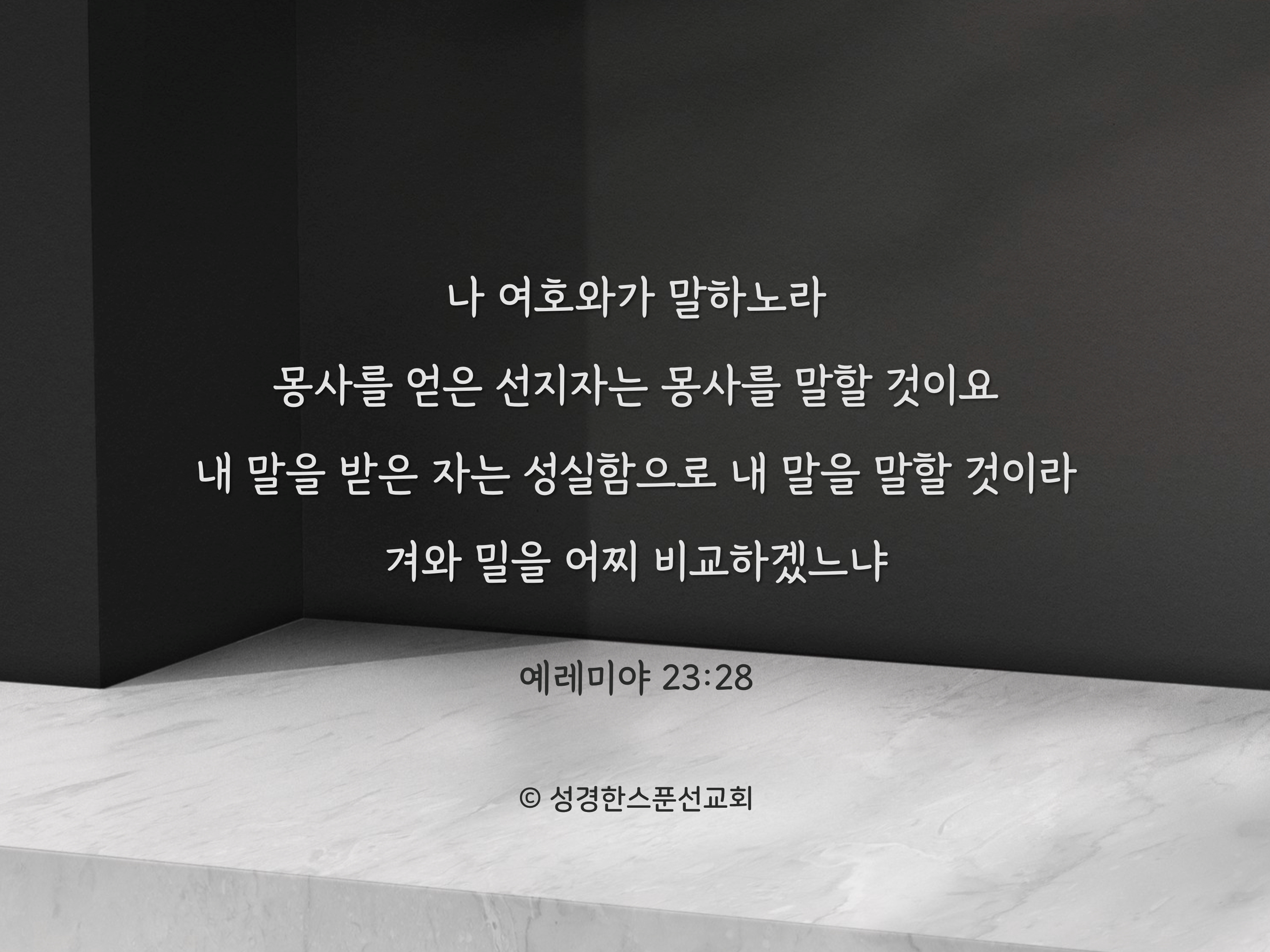🔅오늘의 성경 한스푼/묵상나눔 몽사를 얻은 선지자는 몽사를 말할 것이요 내 말을 받은 자는 성실함으로 내 말을 말할 것이라 bibleonespoon 2023. 8. 22. 08:20 핸드폰 배경화면, SNS 프로필 사진, 암송카드 등 개인적인 용도로는 자유롭게 활용하셔도 좋습니다. (2-3초간 꾹 누르시면 이미지 저장이 가능합니다♡) 공유하기 게시글 관리 성경한스푼선교회 '🔅오늘의 성경 한스푼/묵상나눔' Related Articles 살아있는 교회-사역 돌아서지 말고, 마음을 다하여 여호와를 섬기라 위기 가운데 주만 섬기기로 결정 스스로 새로움을 만드는 분 앞에