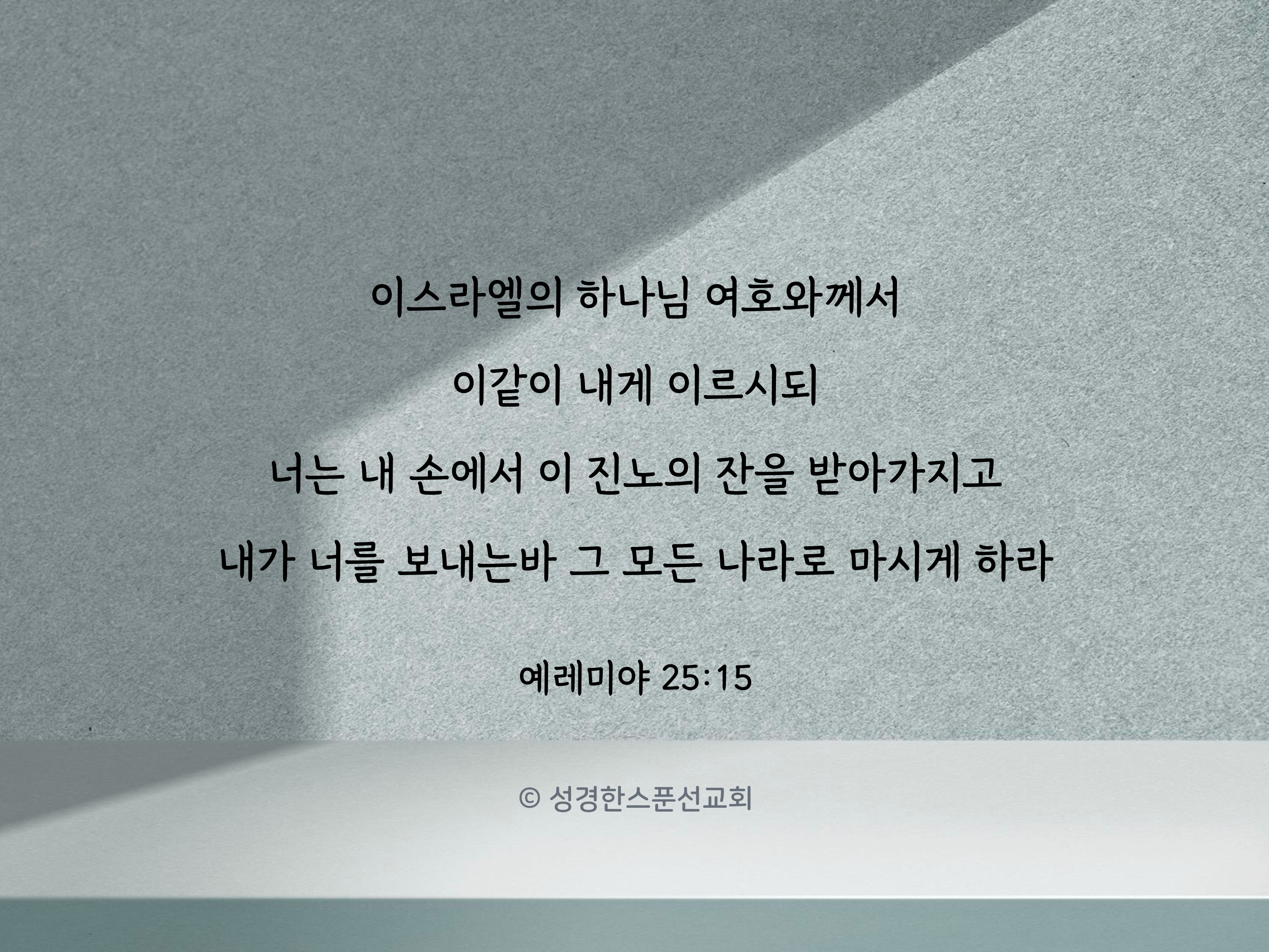 🔅오늘의 성경 한스푼/말씀카드 너는 내 손에서 이 진노의 잔을 받아가지고 내가 너를 보내는바 그 모든 나라로 마시게 하 bibleonespoon 2023. 8. 25. 07:34 공유하기 게시글 관리 성경한스푼선교회 '🔅오늘의 성경 한스푼/말씀카드' Related Articles 높이 계신 여호와의 능력은 많은 물소리와 바다의 큰 파도보다 위대하시나이다 저가 너를 그 깃으로 덮으시리니 네가 그 날개 아래 피하리로다 나 여호와가 말하노라 칠십년이 마치면 내가 바벨론 왕과 그 나라와 갈대아인의 땅을 그 죄악으로 인하여 벌하며 영영히 황무케 하 내가 여호와인줄 아는 마음을 그들에게 주어서 그들로 전심으로 내게 돌아오게 하리니
