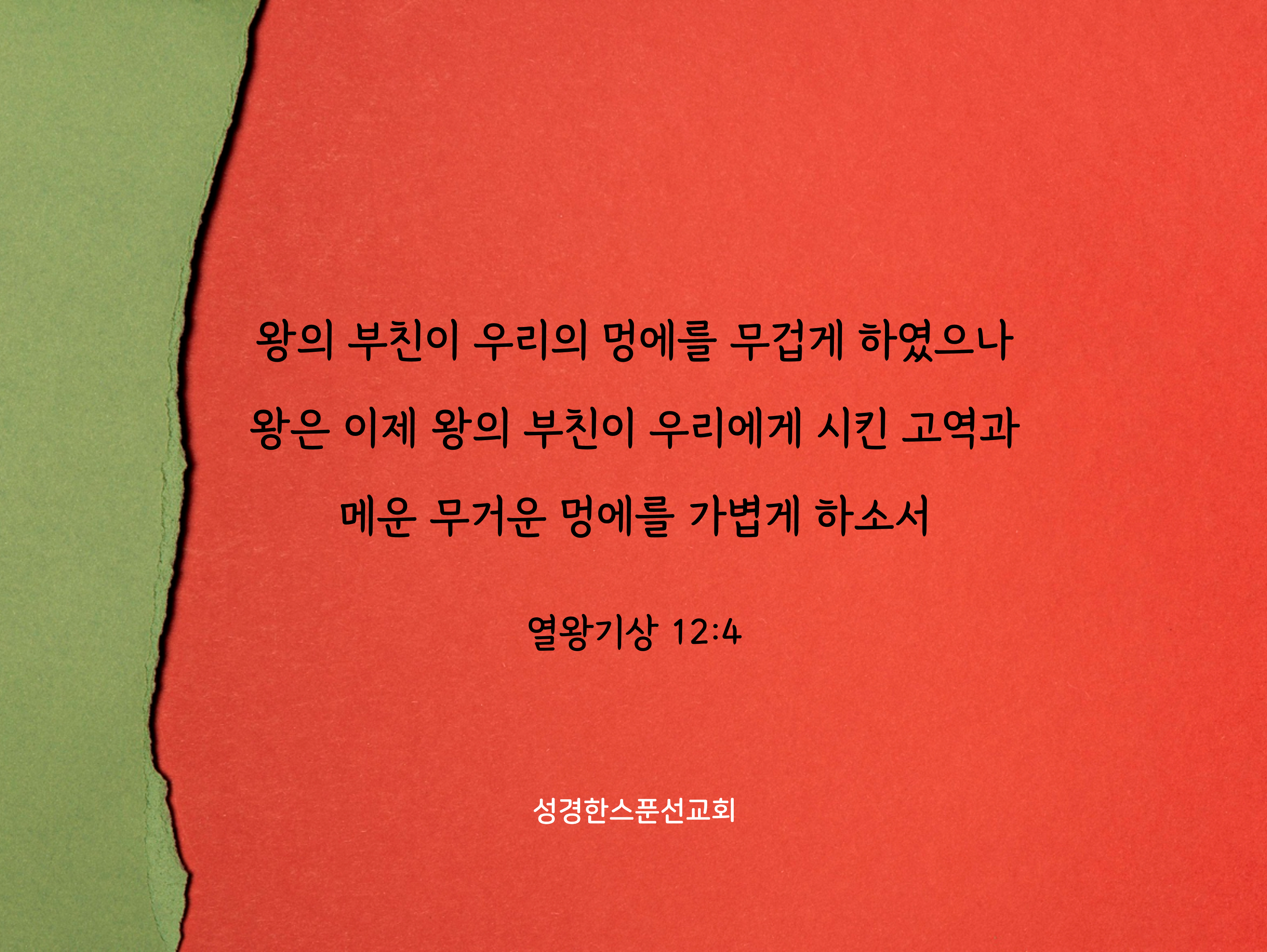 왕은 이제 왕의 부친이 우리에게 시킨 고역과 메운 무거운 멍에를 가볍게 하소서