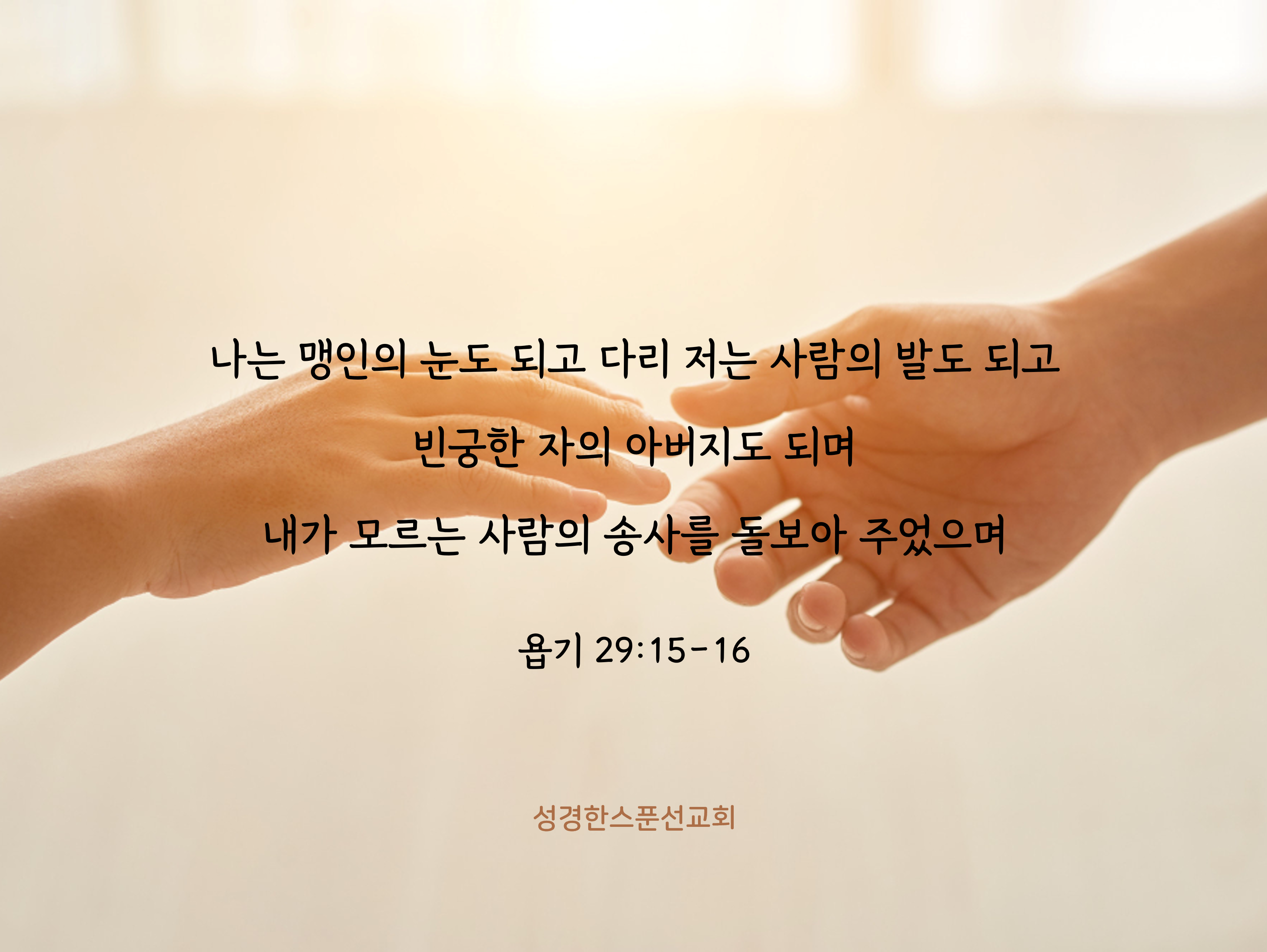 🔅오늘의 성경 한스푼/말씀카드 나는 맹인의 눈도 되고 다리 저는 사람의 발도 되고 빈궁한 자의 아버지도 되며 bibleonespoon 2023. 12. 4. 07:56 공유하기 게시글 관리 성경한스푼선교회 '🔅오늘의 성경 한스푼/말씀카드' Related Articles 그가 내 길을 살피지 아니하시느냐 내 걸음을 다 세지 아니하시느냐 이는 하나님이 내 활시위를 늘어지게 하시고 나를 곤고하게 하심으로 무리가 내 앞에서 굴레를 벗었음이니라 하물며 그분의 권능에 찬 우레 소리를 누가 이해할 수 있겠느냐! 하나님이 악한 자들에게 안정을 주셔서 그들을 평안하게 하여 주시는 듯하지만, 하나님은 그들의 행동을 낱낱이 살피신다