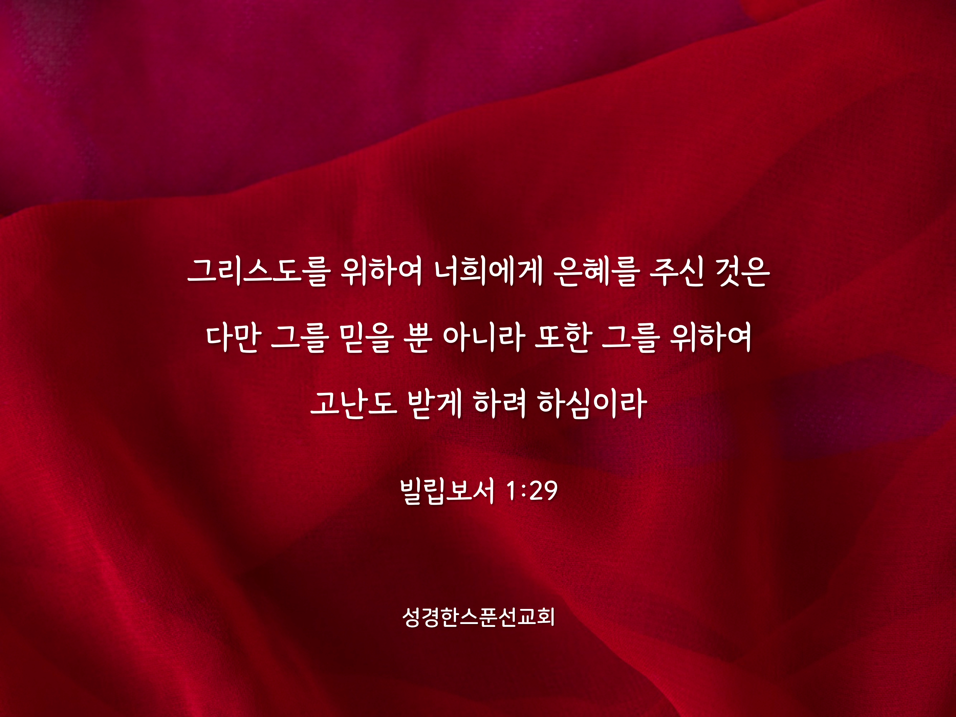 🔅오늘의 성경 한스푼/말씀카드 그리스도를 위하여 너희에게 은혜를 주신 것은 다만 그를 믿을 뿐 아니라 또한 그를 위하여 고난도 받게 하려 하심이라 bibleonespoon 2023. 12. 22. 08:04 공유하기 게시글 관리 성경한스푼선교회 '🔅오늘의 성경 한스푼/말씀카드' Related Articles 아무 것도 염려하지 말고 다만 모든 일에 기도와 간구로, 너희 구할 것을 감사함으로 하나님께 아뢰라 푯대를 향하여 그리스도 예수 안에서 하나님이 위에서 부르신 부름의 상을 위하여 달려가노라 선한 일을 여러분 가운데서 시작하신 분께서 그리스도의 예수의 날까지 그 일을 완성하시리라고 나는 확신합니다 내가 주께 대하여 귀로 듣기만 하였사오나 이제는 눈으로 주를 뵈옵나이다