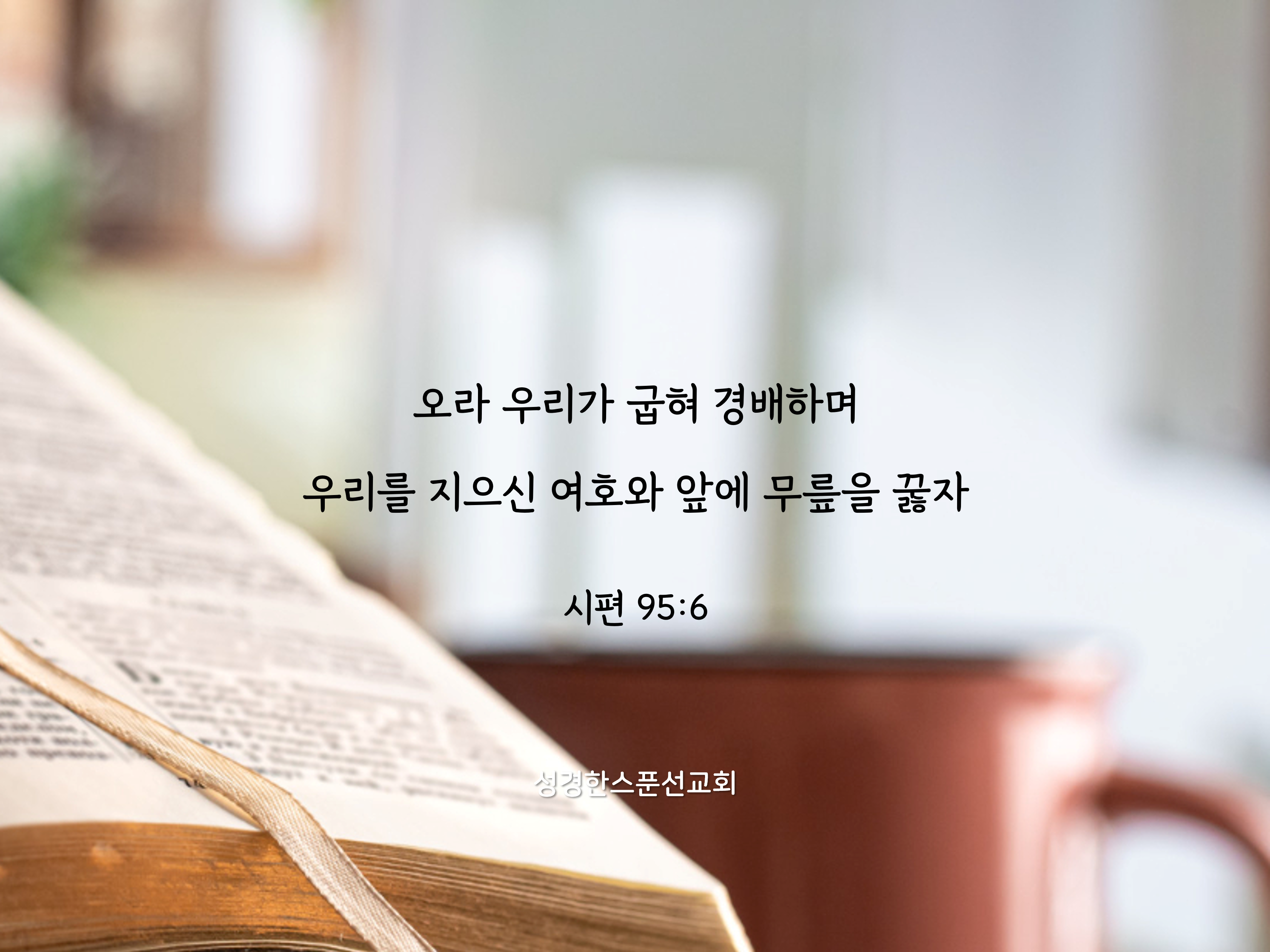 오라 우리가 굽혀 경배하며 우리를 지으신 여호와 앞에 무릎을 꿇자
