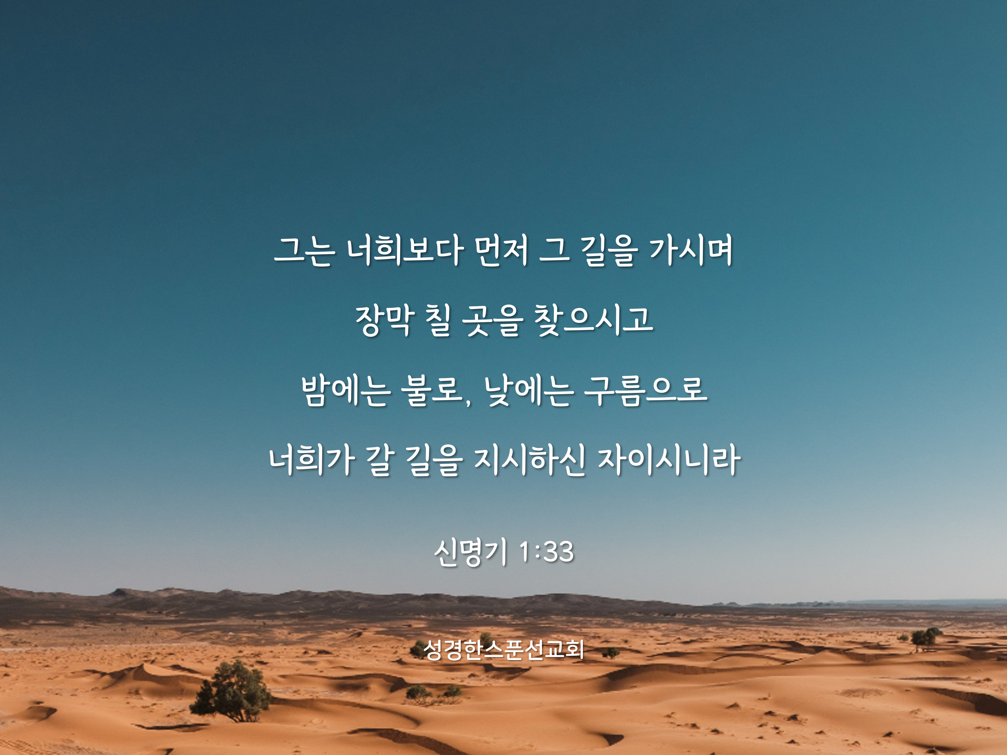 🔅오늘의 성경 한스푼/말씀카드 그는 너희보다 먼저 그 길을 가시며 장막 칠 곳을 찾으시고 밤에는 불로, 낮에는 구름으로 너희가 갈 길을 지시하신 자이시니라 bibleonespoon 2024. 1. 2. 08:28 공유하기 게시글 관리 성경한스푼선교회 '🔅오늘의 성경 한스푼/말씀카드' Related Articles 그들의 땅은 한 발자국도 너희에게 주지 아니하리니 이는 내가 세일 산을 에서에게 기업으로 주었음이라 당시에 선악을 분별하지 못하던 너희의 자녀들도 그리로 들어갈 것이라 내가 그 땅을 그들에게 주어 산업이 되게 하리라 의인을 위하여 빛을 뿌리고 마음이 정직한 자를 위하여 기쁨을 뿌리시는도다 그가 의로 세계를 심판하시며 그의 진실하심으로 백성을 심판하시리로다