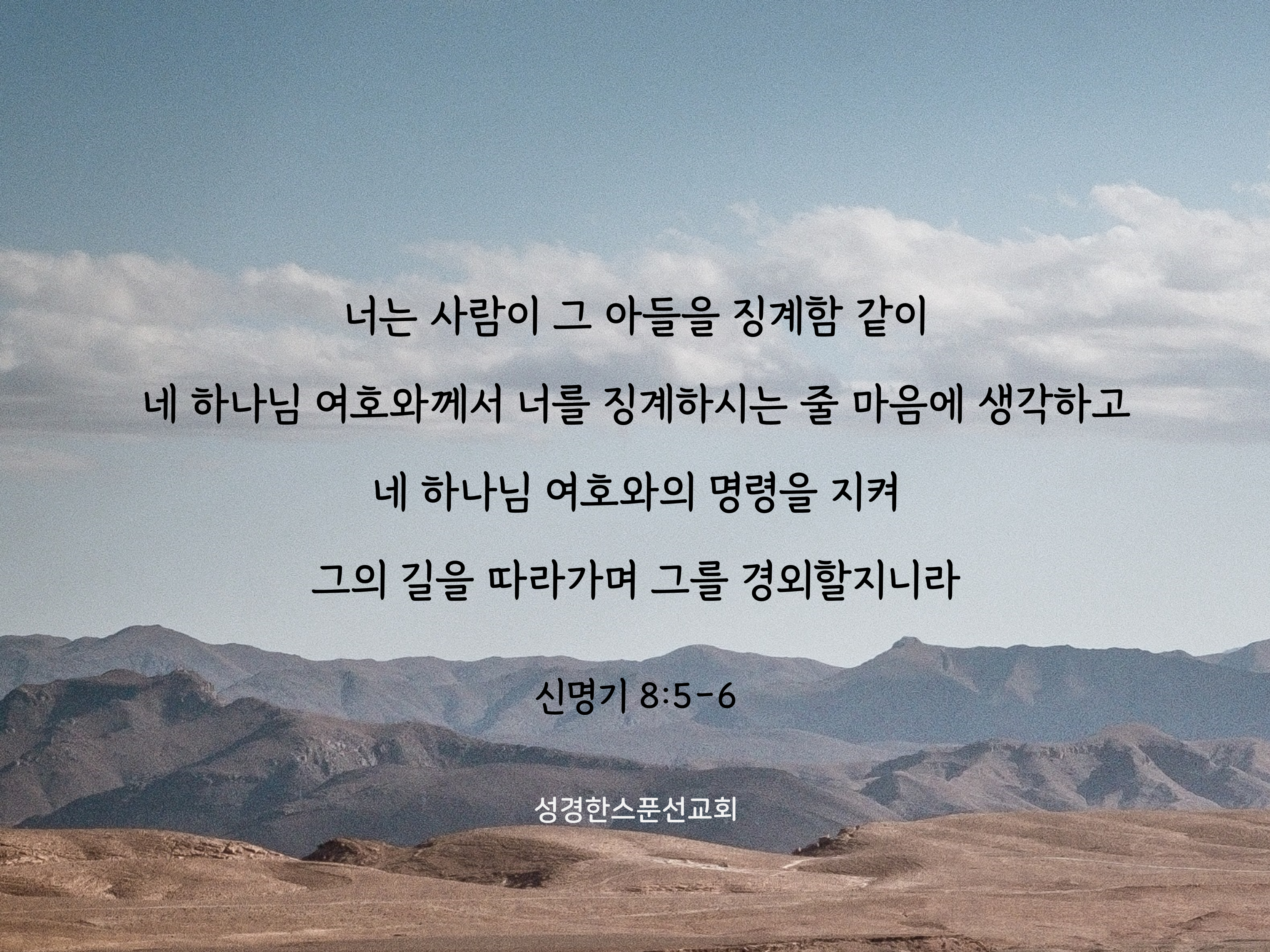 🔅오늘의 성경 한스푼/말씀카드 너는 사람이 그 아들을 징계함 같이 네 하나님 여호와께서 너를 징계하시는 줄 마음에 생각하고 bibleonespoon 2024. 1. 18. 07:56 공유하기 게시글 관리 성경한스푼선교회 '🔅오늘의 성경 한스푼/말씀카드' Related Articles 네 하나님 여호와를 경외하여 그의 모든 도를 행하고 그를 사랑하는 마음을 다하고 뜻을 다하여 네 하나님 여호와를 섬기고 네 소유가 다 풍부하게 될 때에 네 마음이 교만하여 네 하나님 여호와를 잊어버릴까 염려하노라 너희가 이 모든 법도를 듣고 지켜 행하면 네 하나님 여호와께서 네 조상들에게 맹세하신 언약을 지켜 네게 인애를 베푸실 것이라 여호와께서 다만 너희를 사랑하심으로 말미암아