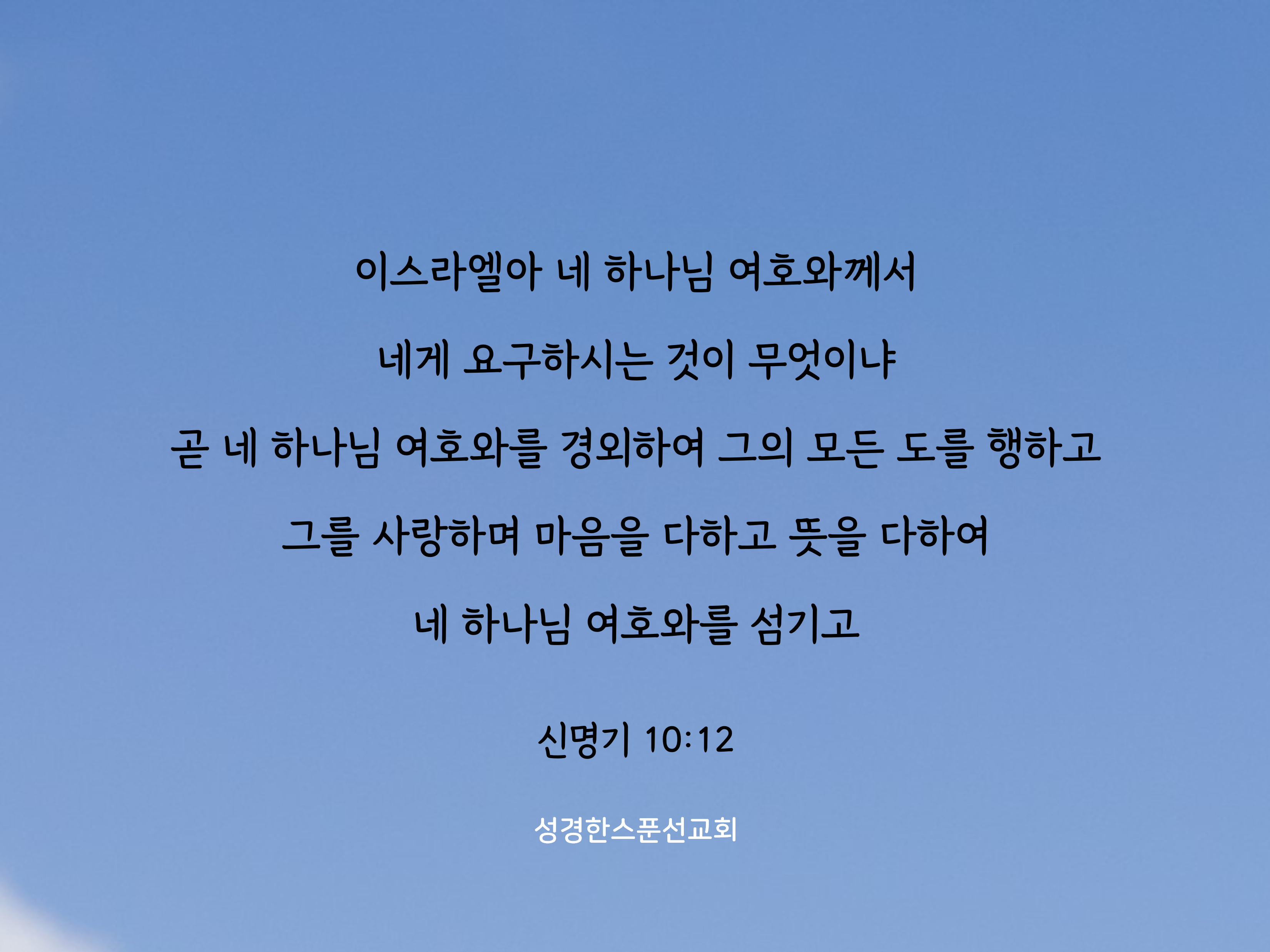🔅오늘의 성경 한스푼/말씀카드 네 하나님 여호와를 경외하여 그의 모든 도를 행하고 그를 사랑하는 마음을 다하고 뜻을 다하여 네 하나님 여호와를 섬기고 bibleonespoon 2024. 1. 22. 08:27 공유하기 게시글 관리 성경한스푼선교회 '🔅오늘의 성경 한스푼/말씀카드' Related Articles 이러므로 너희는 나의 이 말을 너희의 마음과 뜻에 두고 또 그것을 너희의 손목에 매어 기호를 삼고 너희 미간에 붙여 표를 삼으며 너희의 하나님 여호와를 사랑하여 마음을 다하고 뜻을 다하여 섬기면 여호와께서 너희의 땅에 이른 비, 늦은 비를 적당한 때에 내리시리니 네 소유가 다 풍부하게 될 때에 네 마음이 교만하여 네 하나님 여호와를 잊어버릴까 염려하노라 너는 사람이 그 아들을 징계함 같이 네 하나님 여호와께서 너를 징계하시는 줄 마음에 생각하고