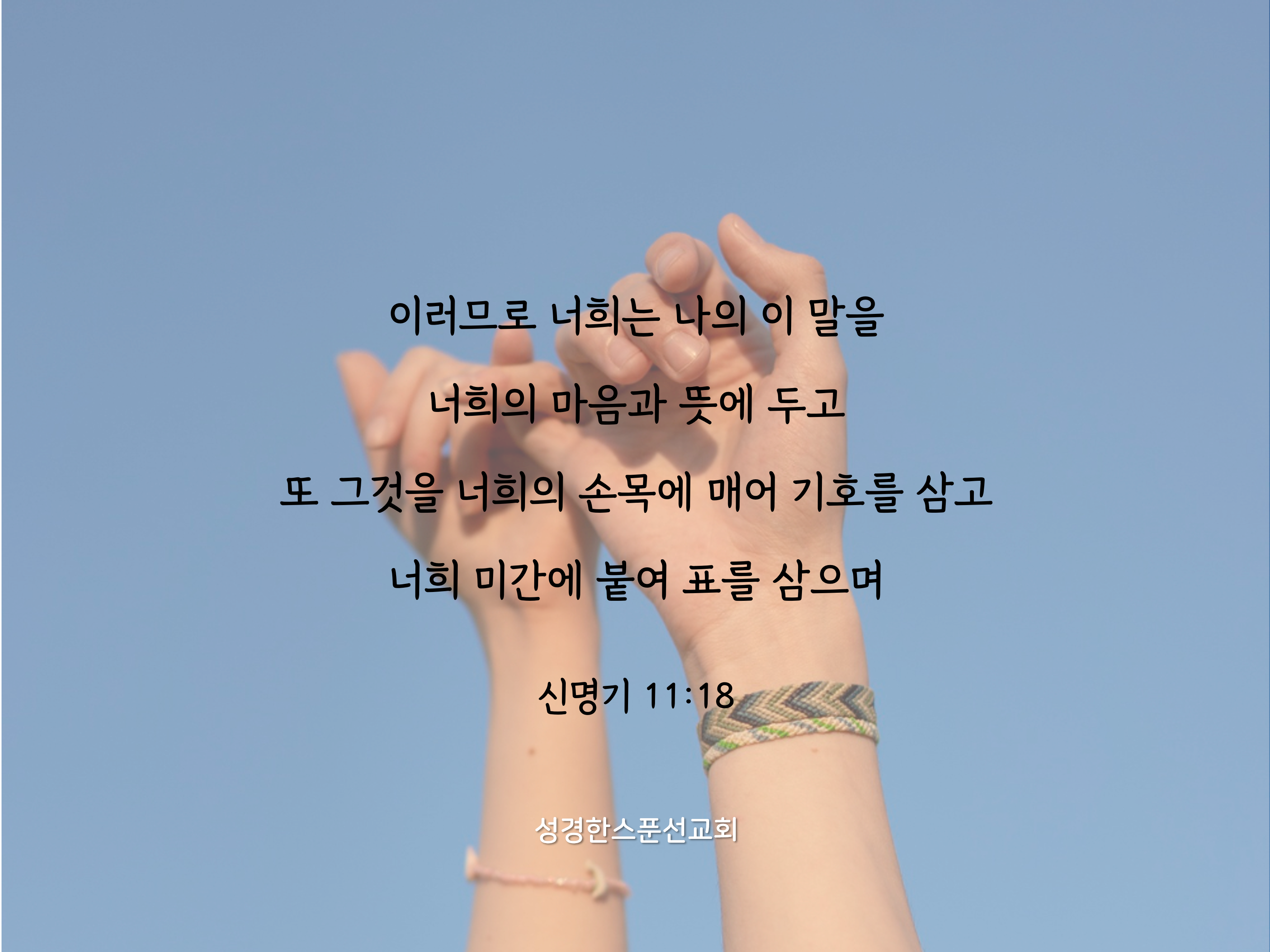 🔅오늘의 성경 한스푼/말씀카드 이러므로 너희는 나의 이 말을 너희의 마음과 뜻에 두고 또 그것을 너희의 손목에 매어 기호를 삼고 너희 미간에 붙여 표를 삼으며 bibleonespoon 2024. 1. 24. 07:33 공유하기 게시글 관리 성경한스푼선교회 '🔅오늘의 성경 한스푼/말씀카드' Related Articles 또 네 소와 양의 처음 난 것을 먹고 네 하나님 여호와 경외하기를 항상 배울 것이니라 네 하나님 여호와의 목전에 선과 의를 행하면 너와 네 후손에게 영구히 복이 있으리라 너희의 하나님 여호와를 사랑하여 마음을 다하고 뜻을 다하여 섬기면 여호와께서 너희의 땅에 이른 비, 늦은 비를 적당한 때에 내리시리니 네 하나님 여호와를 경외하여 그의 모든 도를 행하고 그를 사랑하는 마음을 다하고 뜻을 다하여 네 하나님 여호와를 섬기고