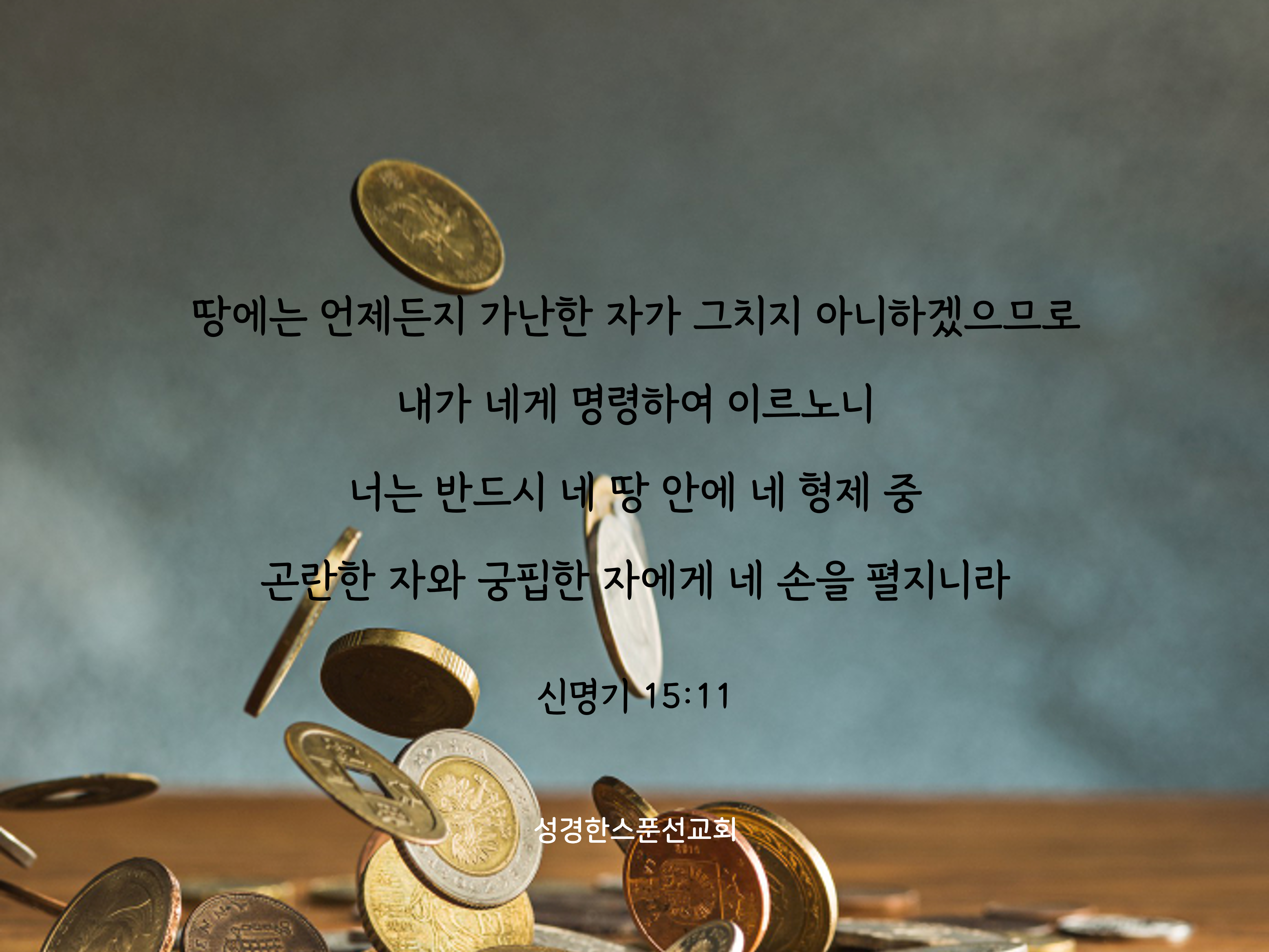 🔅오늘의 성경 한스푼/말씀카드 너는 반드시 네 땅 안에 네 형제 중 곤란한 자와 궁핍한 자에게 네 손을 펼지니라 bibleonespoon 2024. 1. 30. 08:33 공유하기 게시글 관리 성경한스푼선교회 '🔅오늘의 성경 한스푼/말씀카드' Related Articles 너는 마땅히 공의만을 따르라 그리하면 네가 살겠고 네 하나님 여호와께서 네 모든 소출과 네 손으로 행한 모든 일에 복 주실 것이니 너는 온전히 즐거워할지니라 또 네 소와 양의 처음 난 것을 먹고 네 하나님 여호와 경외하기를 항상 배울 것이니라 네 하나님 여호와의 목전에 선과 의를 행하면 너와 네 후손에게 영구히 복이 있으리라