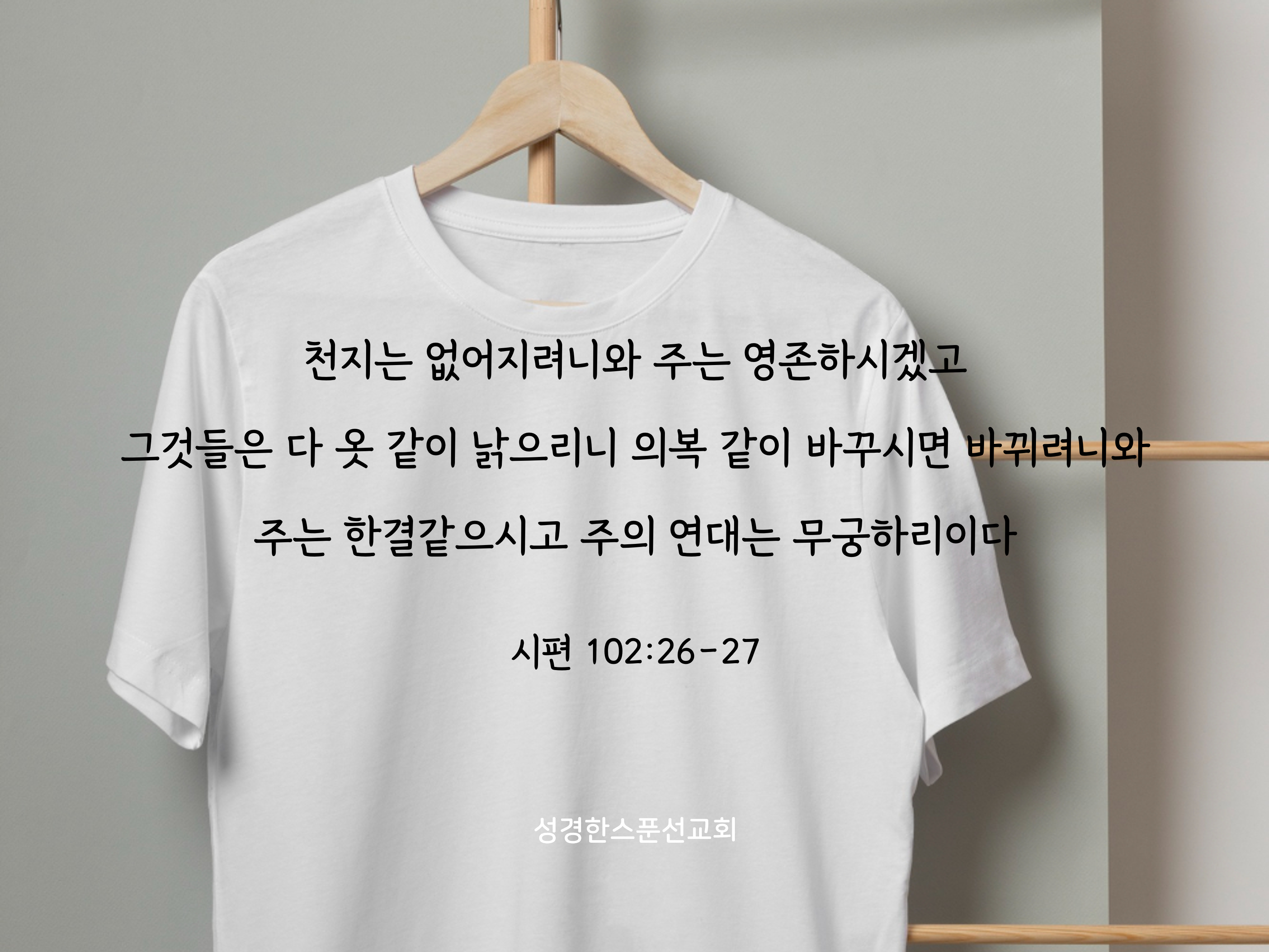🔅오늘의 성경 한스푼/말씀카드 그것들은 다 옷 같이 낡으리니 의복 같이 바꾸시면 바뀌려니와 주는 한결같으시고 주의 연대는 무궁하리이다 bibleonespoon 2024. 2. 7. 08:33 공유하기 게시글 관리 성경한스푼선교회 '🔅오늘의 성경 한스푼/말씀카드' Related Articles 나는 의인을 부르러 온 것이 아니요 죄인을 부르러 왔노라 너희는 주의 길을 준비하라 그의 오실 길을 곧게 하라 나의 괴로운 날에 주의 얼굴을 내게서 숨기지 마소서 주의 귀를 내게 기울이사 내가 부르짖는 날에 속히 내게 응답하소서 내가 완전한 마음으로 내 집 안에서 행하리이다