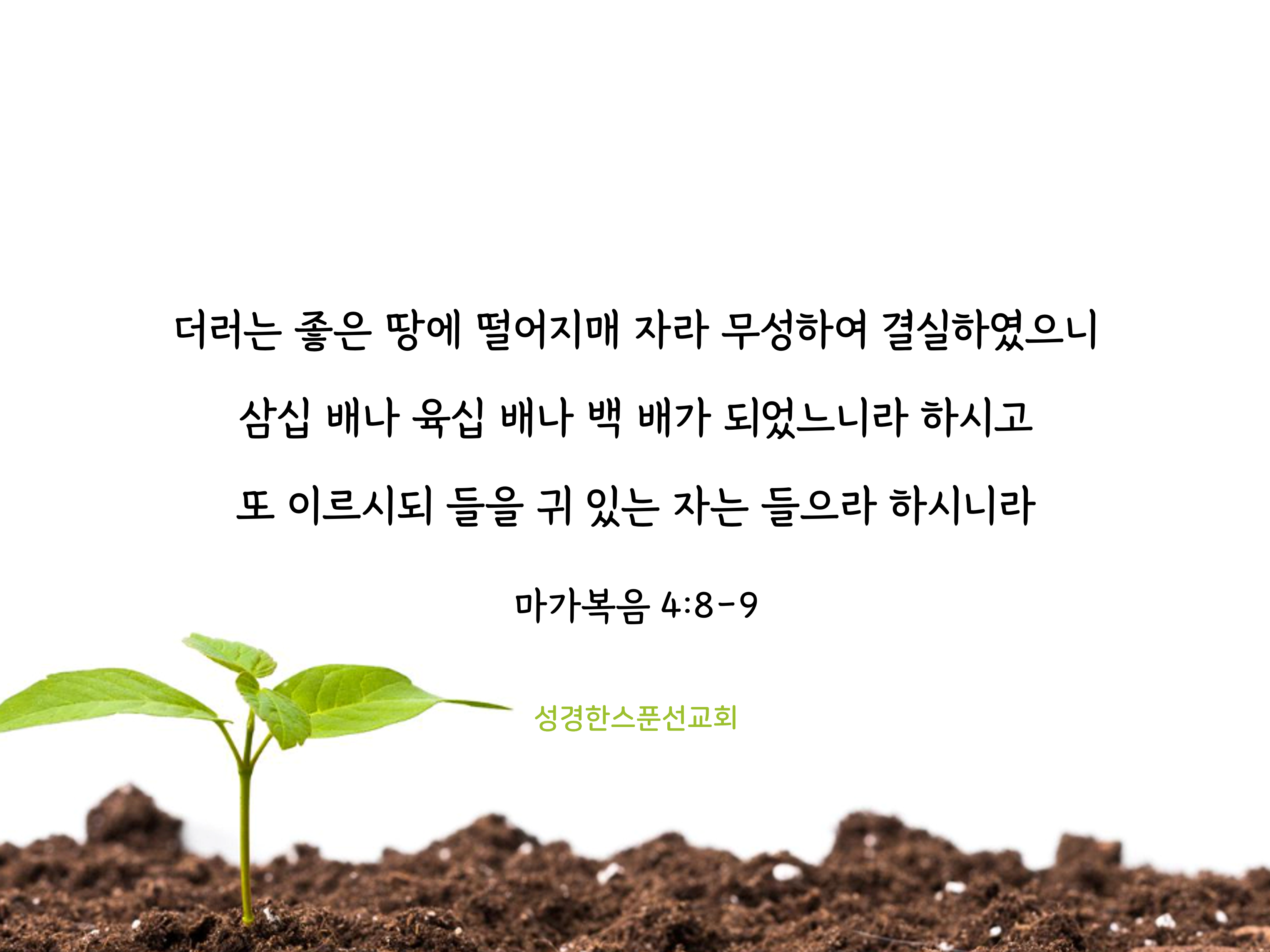 더러는 좋은 땅에 떨어지매 자라 무성하여 결실하였으니 삼십 배나 육십 배나 백 배가 되었으니라 하시고