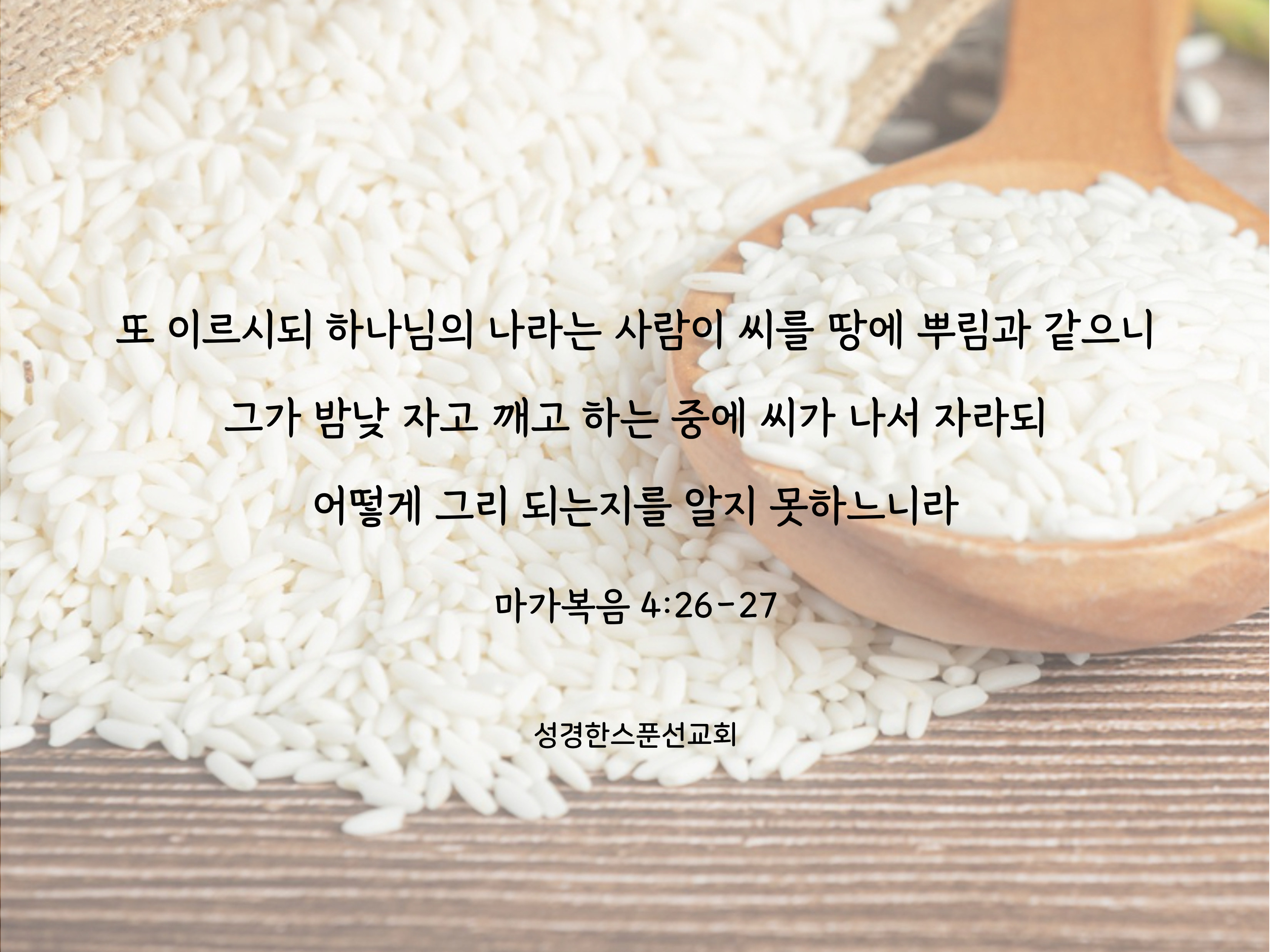 🔅오늘의 성경 한스푼/말씀카드 하나님의 나라는 사람이 씨를 땅에 뿌림과 같으니 그가 밤낮 자고 깨고 하는 중에 씨가 나서 자라되 어떻게 그리 되는지를 알지 못하느니라 bibleonespoon 2024. 2. 19. 07:38 공유하기 게시글 관리 성경한스푼선교회 '🔅오늘의 성경 한스푼/말씀카드' Related Articles 그에게 이르시되 집으로 돌아가 주께서 네게 어떻게 큰 일을 행하사 너를 불쌍히 여기신 것을 네 가족에게 알리라 하시니 그들이 심히 두려워하여 서로 말하되 그가 누구이기에 바람과 바다도 순종하는가 하였더라 더러는 좋은 땅에 떨어지매 자라 무성하여 결실하였으니 삼십 배나 육십 배나 백 배가 되었으니라 하시고 누구든지 하나님의 뜻대로 행하는 자가 내 형제요 자매요 어머니이라