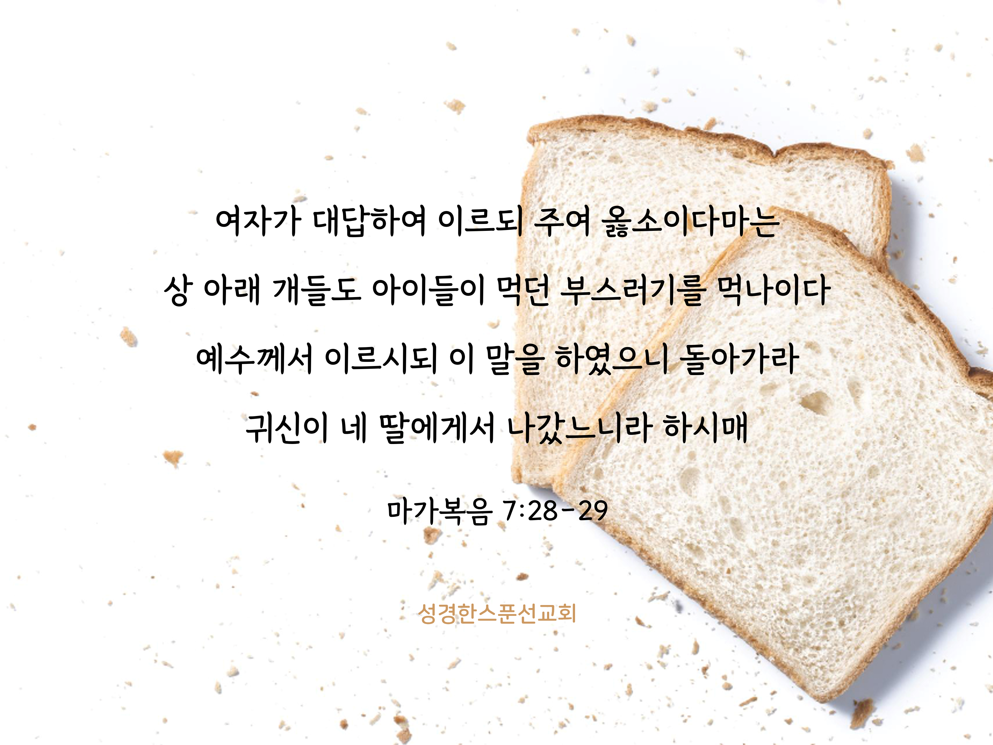 상 아래 개들도 아이들이 먹던 부스러기를 먹나이다 예수께서 이르시되 이 말을 하였으니 돌아가라 귀신이 네 딸에게서 나갔느니라