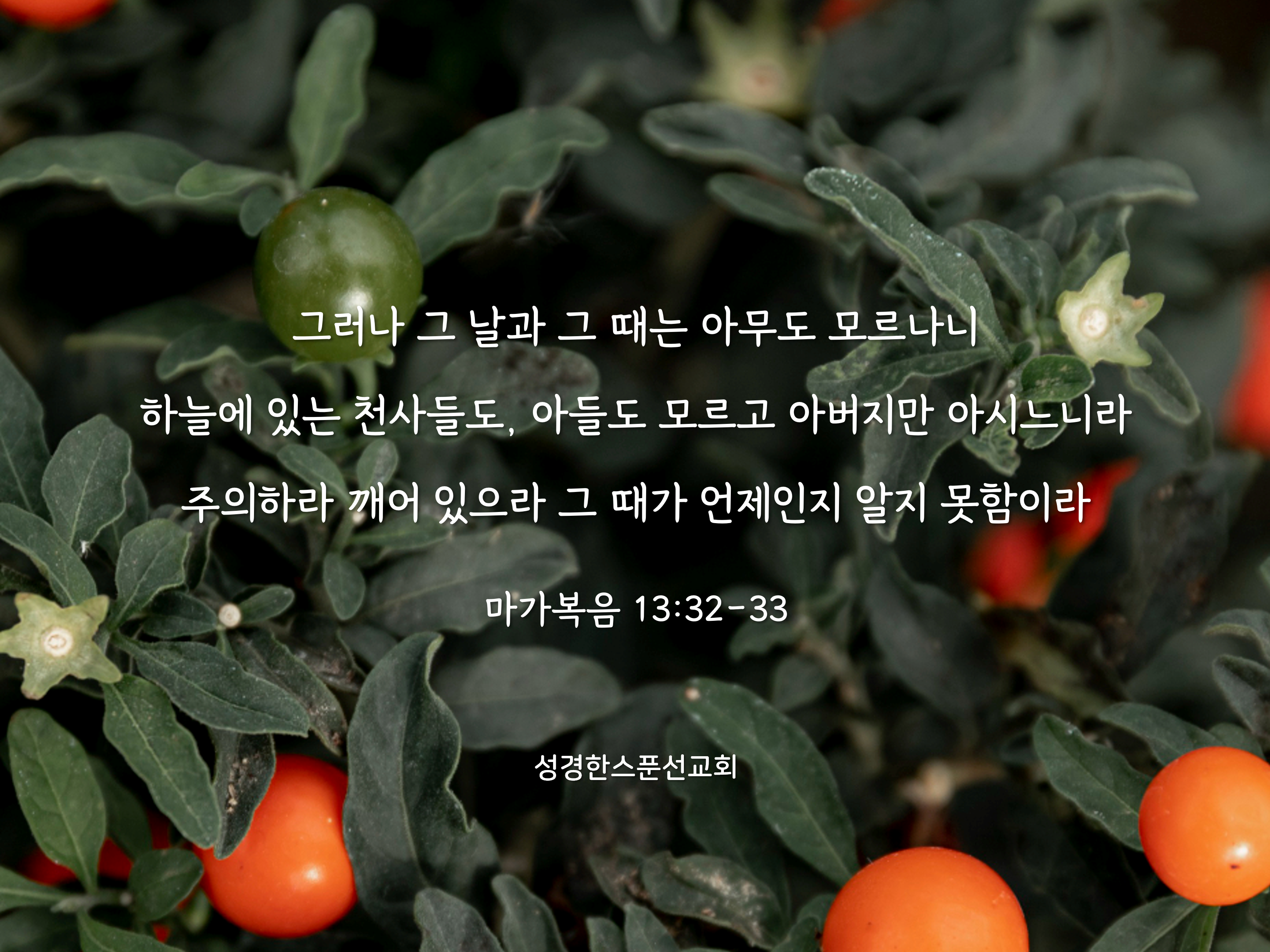 🔅오늘의 성경 한스푼/말씀카드 그러나 그 날과 그 때는 아무도 모르나니 하늘에 있는 천사들도, 아들도 모르고 아버지만 아시느니라 주의하라 깨어 있으라 그 때가 언제인지 알지 못함이라 bibleonespoon 2024. 3. 21. 08:32 공유하기 게시글 관리 성경한스푼선교회 '🔅오늘의 성경 한스푼/말씀카드' Related Articles 시험에 들지 않게 깨어 있어 기도하라 마음에는 원이로되 육신이 약하도다 하시고 그는 힘을 다하여 내 몸에 향유를 부어 내 장례를 미리 준비하였느니라 그 때에 인자가 구름을 타고 큰 권능과 영광으로 오는 것을 사람들이 보리라 또 너희가 내 이름으로 말미암아 모든 사람에게 미움을 받을 것이나 끝까지 견디는 자는 구원을 받으리라