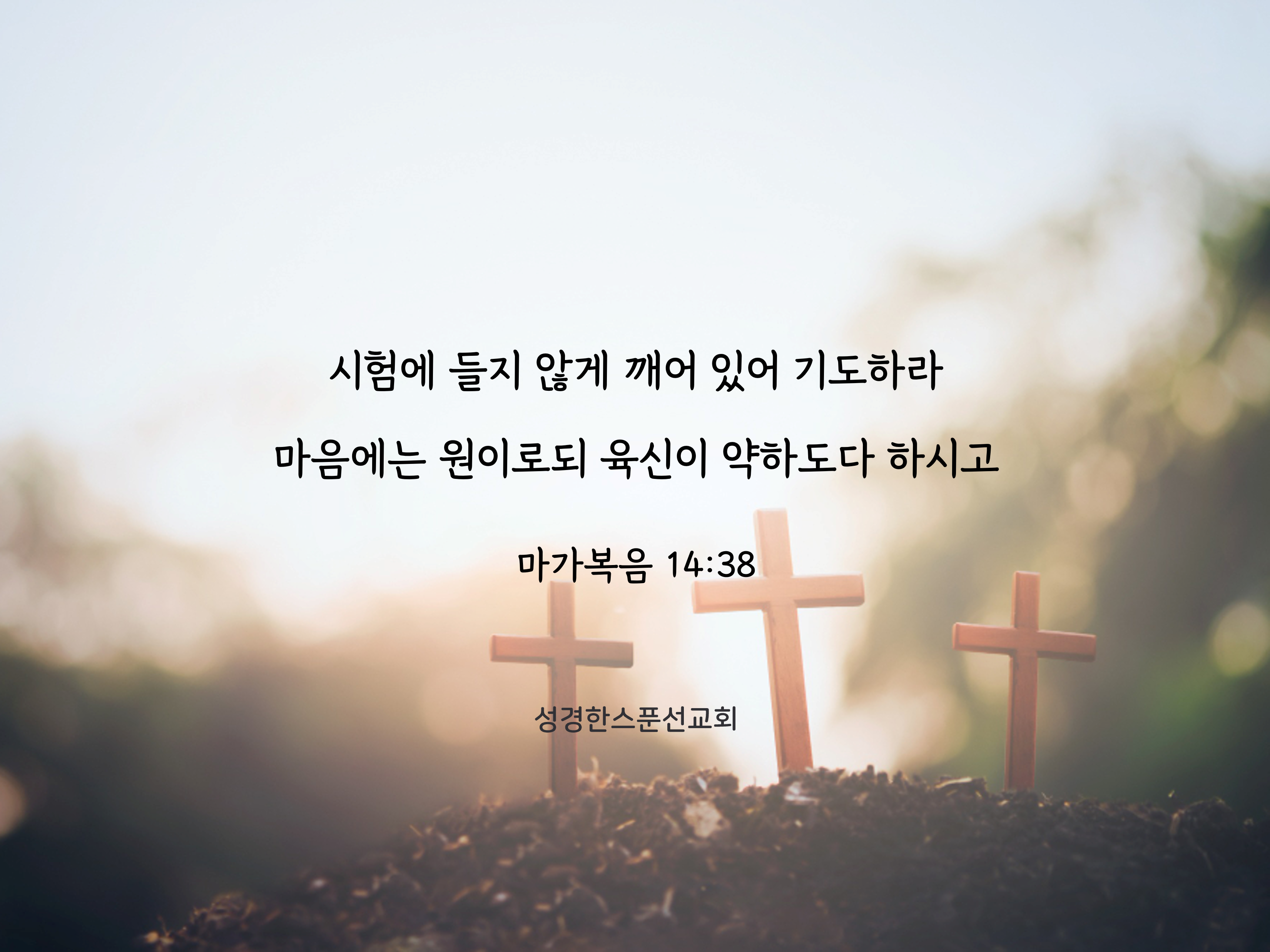 🔅오늘의 성경 한스푼/말씀카드 시험에 들지 않게 깨어 있어 기도하라 마음에는 원이로되 육신이 약하도다 하시고 bibleonespoon 2024. 3. 25. 08:36 공유하기 게시글 관리 성경한스푼선교회 '🔅오늘의 성경 한스푼/말씀카드' Related Articles 너희는 어떻게 생각하느냐 하니 그들이 다 예수를 사형에 해당한 자로 정죄하고 제자들이 다 예수를 버리고 도망하니라 그는 힘을 다하여 내 몸에 향유를 부어 내 장례를 미리 준비하였느니라 그러나 그 날과 그 때는 아무도 모르나니 하늘에 있는 천사들도, 아들도 모르고 아버지만 아시느니라 주의하라 깨어 있으라 그 때가 언제인지 알지 못함이라