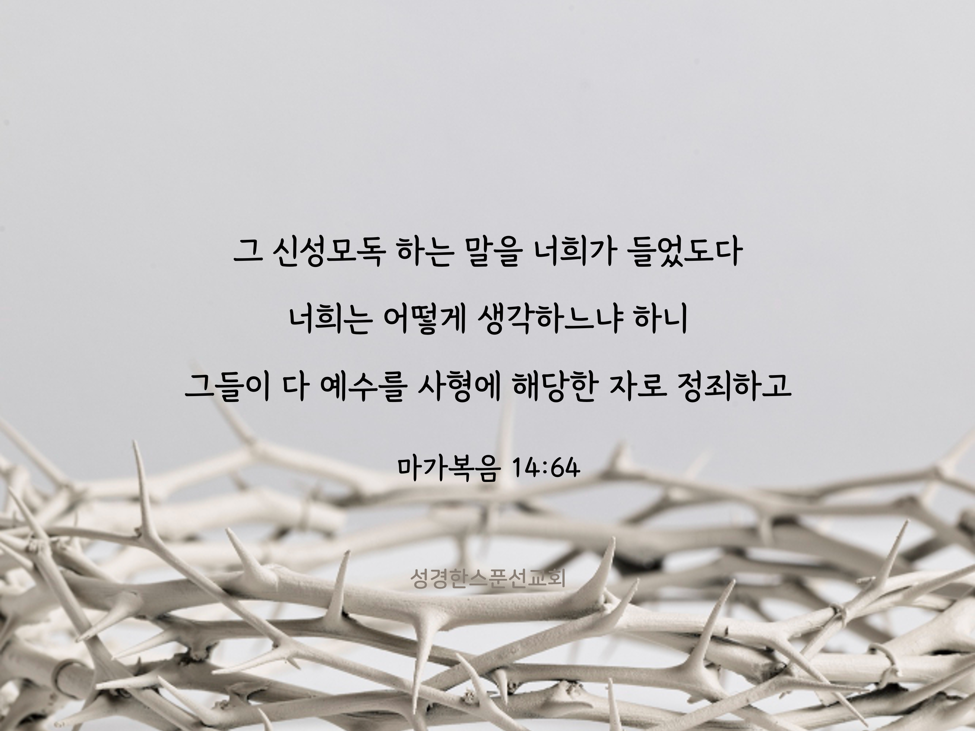 🔅오늘의 성경 한스푼/말씀카드 너희는 어떻게 생각하느냐 하니 그들이 다 예수를 사형에 해당한 자로 정죄하고 bibleonespoon 2024. 3. 27. 08:38 공유하기 게시글 관리 성경한스푼선교회 '🔅오늘의 성경 한스푼/말씀카드' Related Articles 때가 제삼시가 되어 십자가에 못 박으니라 그 위에 있는 죄패에 유대인의 왕이라 썼고 빌라도가 무리에게 만족을 주고자 하여 바라바는 놓아주고 예수는 채찍질하고 십자가에 못 박히게 넘겨 주니라 제자들이 다 예수를 버리고 도망하니라 시험에 들지 않게 깨어 있어 기도하라 마음에는 원이로되 육신이 약하도다 하시고