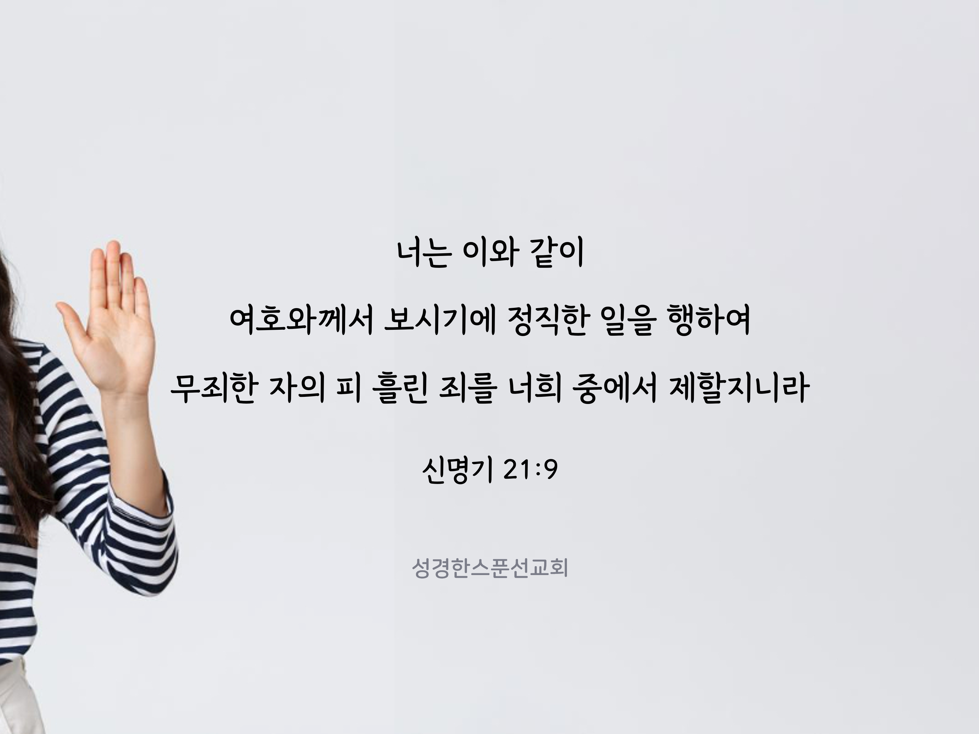 🔅오늘의 성경 한스푼/말씀카드 너는 이와 같이 여호와께서 보시기에 정직한 일을 행하여 무죄한 자의 피 흘린 죄를 너희 중에서 제할지니라 bibleonespoon 2024. 4. 4. 08:29 공유하기 게시글 관리 성경한스푼선교회 '🔅오늘의 성경 한스푼/말씀카드' Related Articles 네 하나님 여호와께 서원하거든 갚기를 더디하지 말라 네 형제의 나귀나 소가 길에 넘어진 것을 보거든 못 본 체하지 말고 너는 반드시 형제를 도와 그것들을 일으킬지니라 그들을 두려워하지 말라 애굽 땅에서 너를 인도하여 내신 네 하나님 여호와꼐서 너와 함께 하시느니라 네 하나님 여호와께서 네게 기업으로 주시는 땅에서 무죄한 피를 흘리지 말라 이같이 하면 그의 피가 네게로 돌아가지 아니하리라