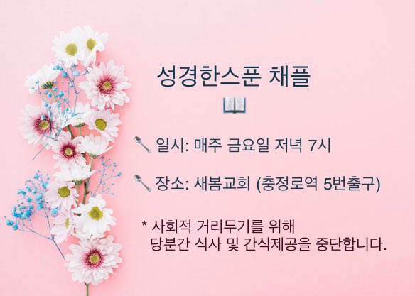 🔅공지 채플을 시작합니다! bibleonespoon 2020. 5. 9. 15:00 "청년이 무엇으로 그의 행실을 깨끗하게 하리이까 주의 말씀만 지킬 따름이니이다" (시편 119:9) ♡5월 15일부터, 매주 금요일 "성경한스푼 채플"이 있습니다♡ 공유하기 게시글 관리 성경한스푼선교회