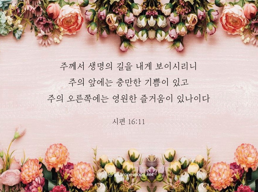 11 주님께서 몸소 생명의 길을 나에게 보여 주시니, 주님을 모시고 사는 삶에 기쁨이 넘칩니다. 주님께서 내 오른쪽에 계시니, 이 큰 즐거움이 영원토록 이어질 것입니다.