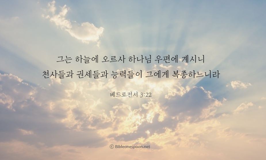 22 그리스도께서는 하늘로 가셔서 하나님의 오른쪽에 계시니, 천사들과 권세들과 능력들이 그에게 복종하고 있습니다.