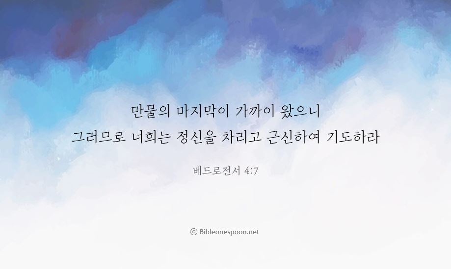 벧전4:7, 새번역] 만물의 마지막이 가까이 왔습니다. 그러므로 정신을 차리고, 삼가 조심하여 기도하십시오.