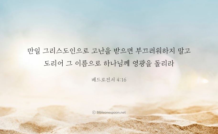 [벧전4:16, 새번역] 그러나 그리스도인으로서 고난을 당하면 부끄러워하지 말고, 도리어 그 이름으로 하나님께 영광을 돌리십시오.