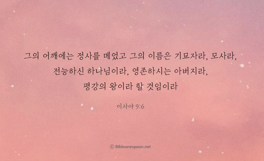 6 한 아기가 우리를 위해 태어났다. 우리가 한 아들을 모셨다. 그는 우리의 통치자가 될 것이다. 그의 이름은 '놀라우신 조언자', '전능하신 하나님', '영존하시는 아버지', '평화의 왕'이라고 불릴 것이다.
