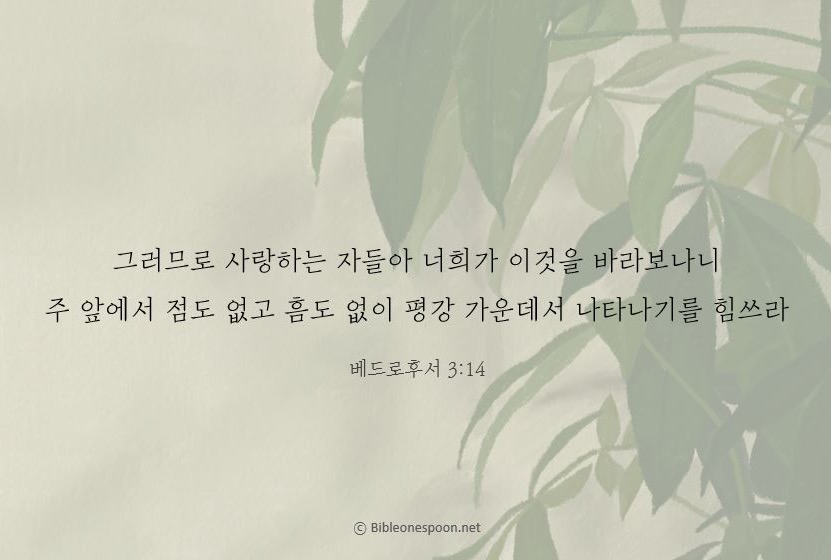 14 사랑하는 여러분, 여러분이 이것을 기다리고 있으니, 티도 없고 흠도 없는 사람으로, 아무 탈이 없이 하나님 앞에 나타날 수 있도록 힘쓰십시오.