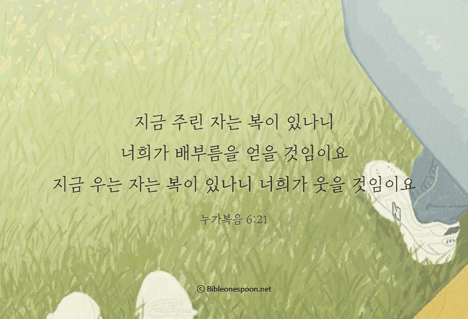 [눅6:21, 새번역] 너희 지금 굶주리는 사람들은 복이 있다. 너희가 배부르게 될 것이다. 너희 지금 슬피 우는 사람들은 복이 있다. 너희가 웃게 될 것이다.