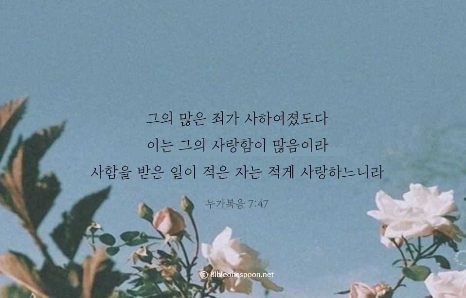 47 그러므로 내가 네게 말한다. 이 여자는 그 많은 죄를 용서받았다. 그것은 그가 많이 사랑하였기 때문이다. 용서받는 것이 적은 사람은 적게 사랑한다."