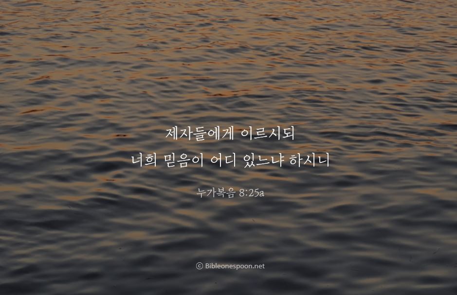 25 예수께서 그들에게 말씀하셨다. "너희의 믿음이 어디에 있느냐?" 그들은 두려워하였고, 놀라서 서로 말하였다. "이분이 도대체 누구시기에 바람과 물을 호령하시니, 바람과 물조차도 그에게 복종하는가?"