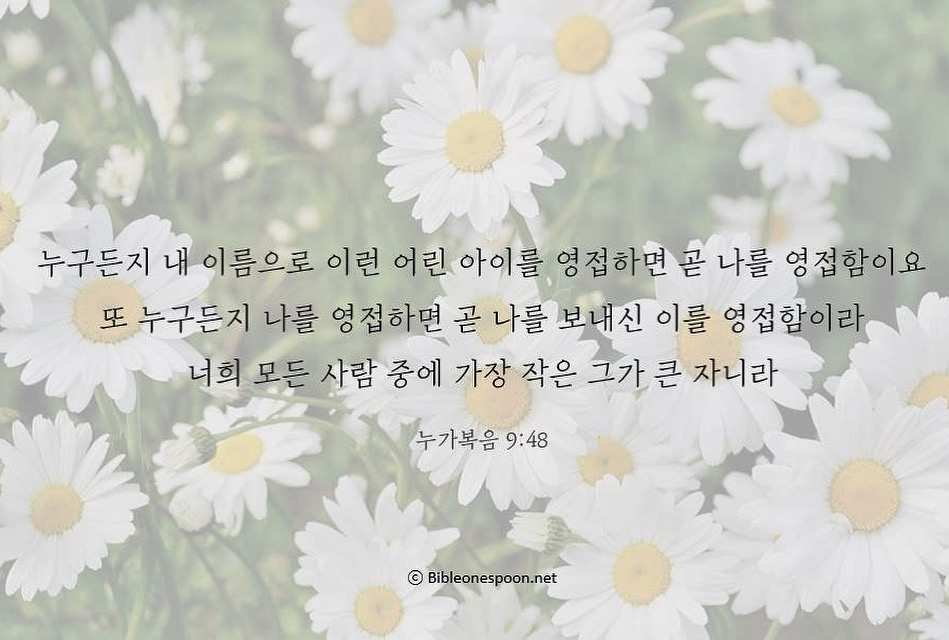48 그들에게 말씀하셨다. "누구든지 내 이름으로 이 어린이를 영접하면 나를 영접하는 것이요, 누구든지 나를 영접하면 나를 보내신 분을 영접하는 것이다. 너희 가운데에서 가장 작은 사람이 큰 사람이다."