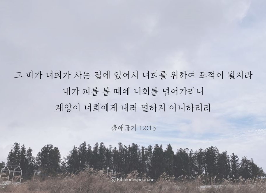 13 문틀에 피를 발랐으면, 그것은 너희가 살고 있는 집의 표적이니, 내가 이집트 땅을 칠 때에, 문설주에 피를 바른 집은, 그 피를 보고 내가 너희를 치지 않고 넘어갈 터이니, 너희는 재앙을 피하여 살아 남을 것이다.