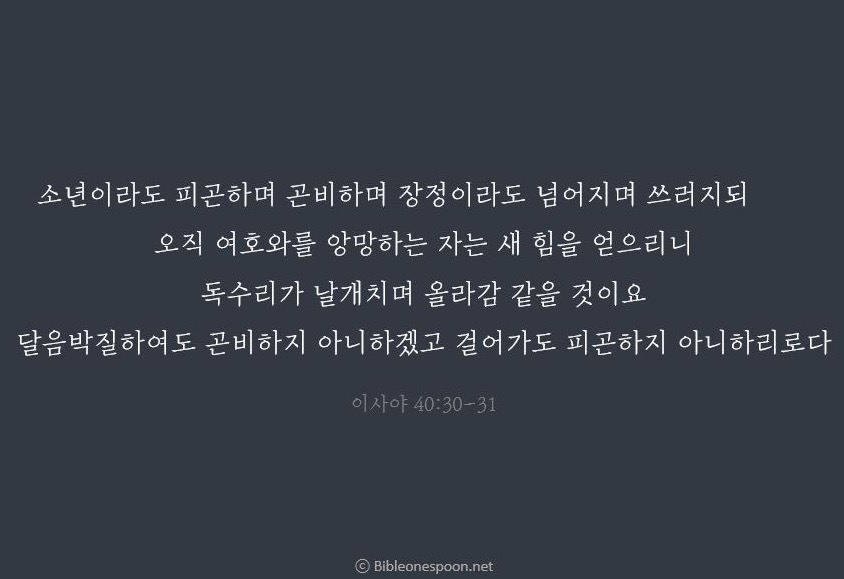 31 오직 주님을 소망으로 삼는 사람은 새 힘을 얻으리니, 독수리가 날개를 치며 솟아오르듯 올라갈 것이요, 뛰어도 지치지 않으며, 걸어도 피곤하지 않을 것이다.