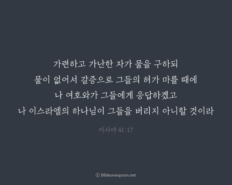 17 가련하고 빈궁한 사람들이 물을 찾지 못하여 갈증으로 그들의 혀가 탈 때에, 나 주가 그들의 기도에 응답하겠고, 나 이스라엘의 하나님이 그들을 버리지 않겠다.