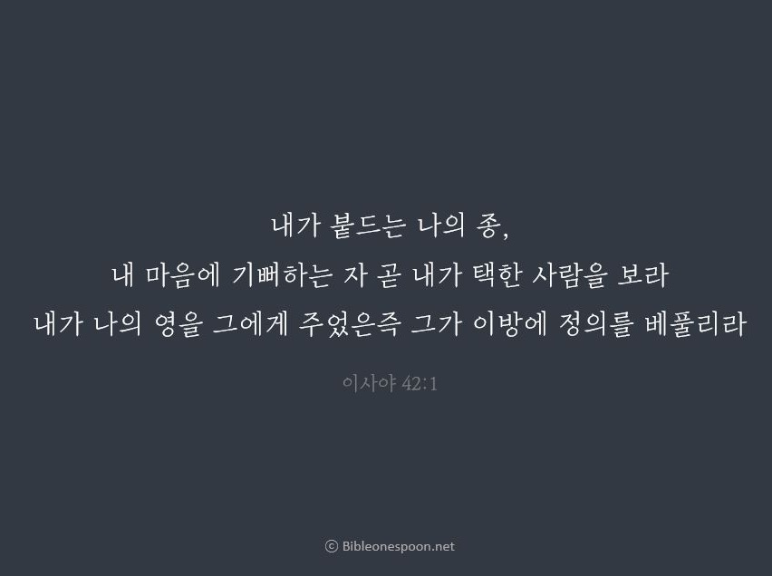 1 "나의 종을 보아라. 그는 내가 붙들어 주는 사람이다. 내가 택한 사람, 내가 마음으로 기뻐하는 사람이다. 내가 그에게 나의 영을 주었으니, 그가 뭇 민족에게 공의를 베풀 것이다.