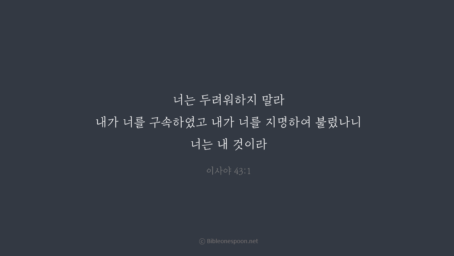 1 그러나 이제 야곱아, 너를 창조하신 주님께서 말씀하신다. 이스라엘아, 너를 지으신 주님께서 말씀하신다. “내가 너를 속량하였으니, 두려워하지 말아라. 내가 너를 지명하여 불렀으니, 너는 나의 것이다.