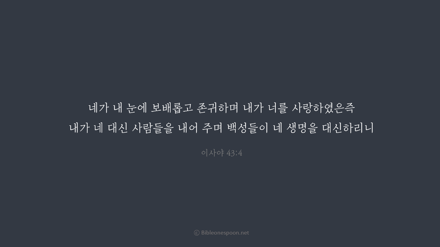 4 내가 너를 보배롭고 존귀하게 여겨 너를 사랑하였으므로, 너를 대신하여 다른 사람들을 내주고, 너의 생명을 대신하여 다른 민족들을 내주겠다.