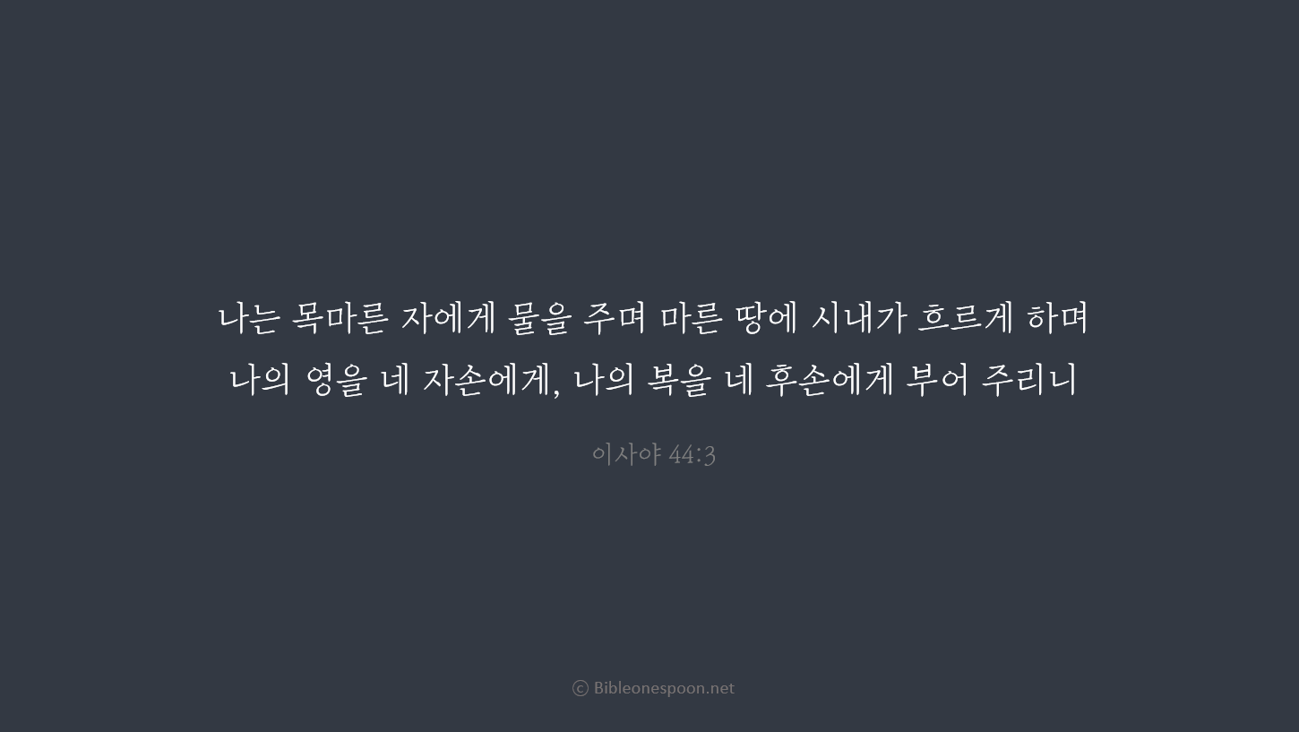 3 내가 메마른 땅에 물을 주고 마른 땅에 시내가 흐르게 하듯이, 네 자손에게 내 영을 부어 주고, 네 후손에게 나의 복을 내리겠다. 4 그들은 마치 시냇물 가의 버들처럼, 풀처럼 무성하게 자랄 것이다.