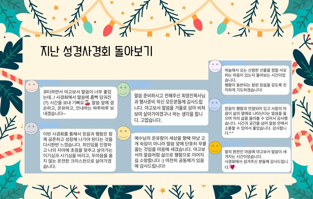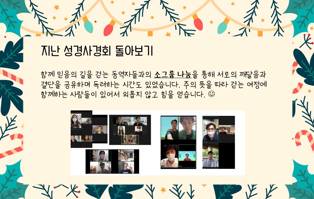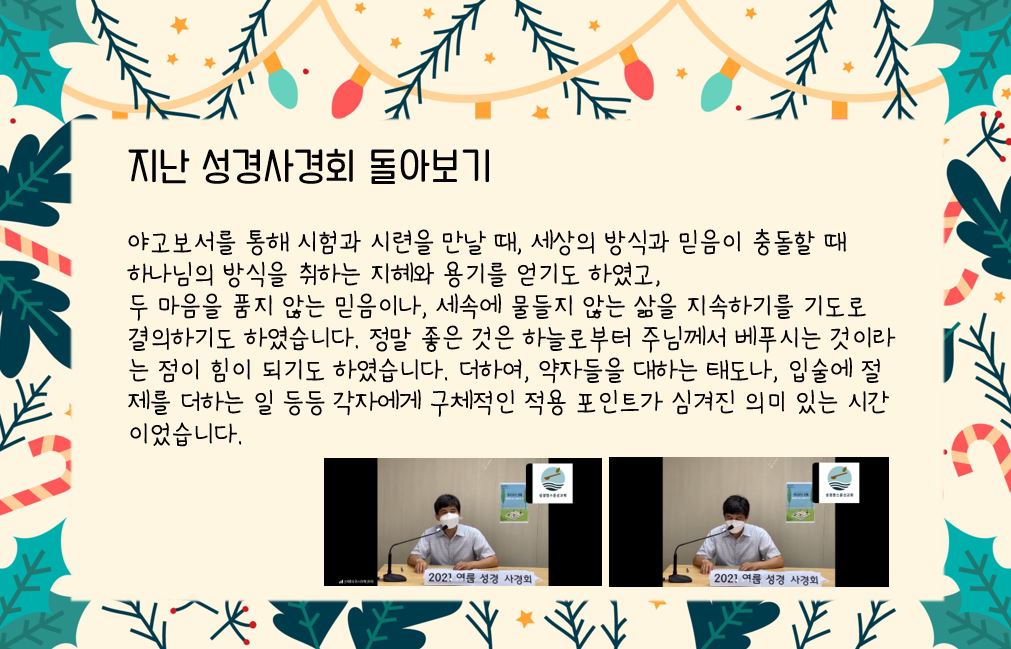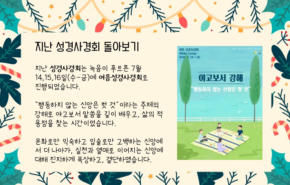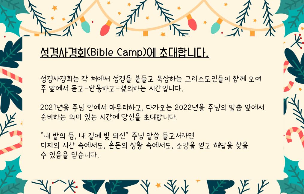 🔅모임과 활동/성경 사경회 [등록 안내] 🌟2022 신년사경회🌟 bibleonespoon 2021. 12. 13. 16:05 ▼▼▼ 2022년도 성경사경회가 곧 개최됩니다 ▼▼▼ 등록하고, 함께해요~! ▶눌러서 등록하러 가기 2022 신년 성경사경회 등록 *일시: 1월 12일(수) - 14일(금) *시간: 7:30pm - 9:30pm (금요일은 7:30-10:00pm) *참여: Zoom을 통한 비대면 *주관: 성경한스푼선교회 & 새봄교회 등록비: 5,000원 등록계좌: 신한은행 / 100033589645 / 성경한스푼선 docs.google.com 공유하기 게시글 관리 성경한스푼선교회 '🔅모임과 활동/성경 사경회' Related Articles [등록 안내] 2022 신년사경회 등록하기🎈 [등록 안내] 2022 성경사경회로 함께 초대해요! [👀다시보기] 2021 여름사경회🌿 [등록] 2021 여름사경회 (Summer Bible Camp) 등록하기
