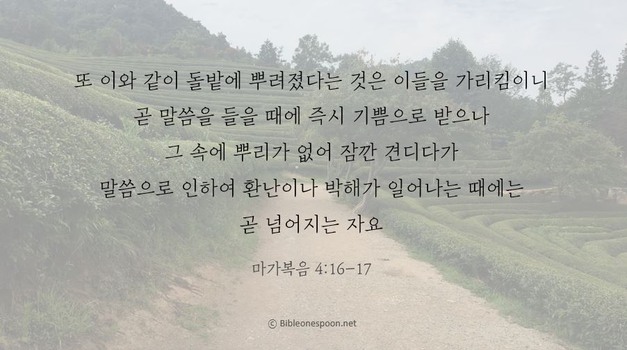 🔅오늘의 성경 한스푼/말씀카드 또 이와 같이 돌밭에 뿌려졌다는 것은 bibleonespoon 2020. 3. 23. 23:30 핸드폰 배경화면, SNS 프로필 사진, 암송카드 등 개인적인 용도로는 자유롭게 활용하셔도 좋습니다 ♡ 공유하기 게시글 관리 성경한스푼선교회 '🔅오늘의 성경 한스푼/말씀카드' Related Articles 좋은 땅에 뿌려졌다는 것은 어떤 이는 가시떨기에 뿌려진 자니 말씀이 길 가에 뿌려졌다는 것은 우리가 일어나 벧엘로