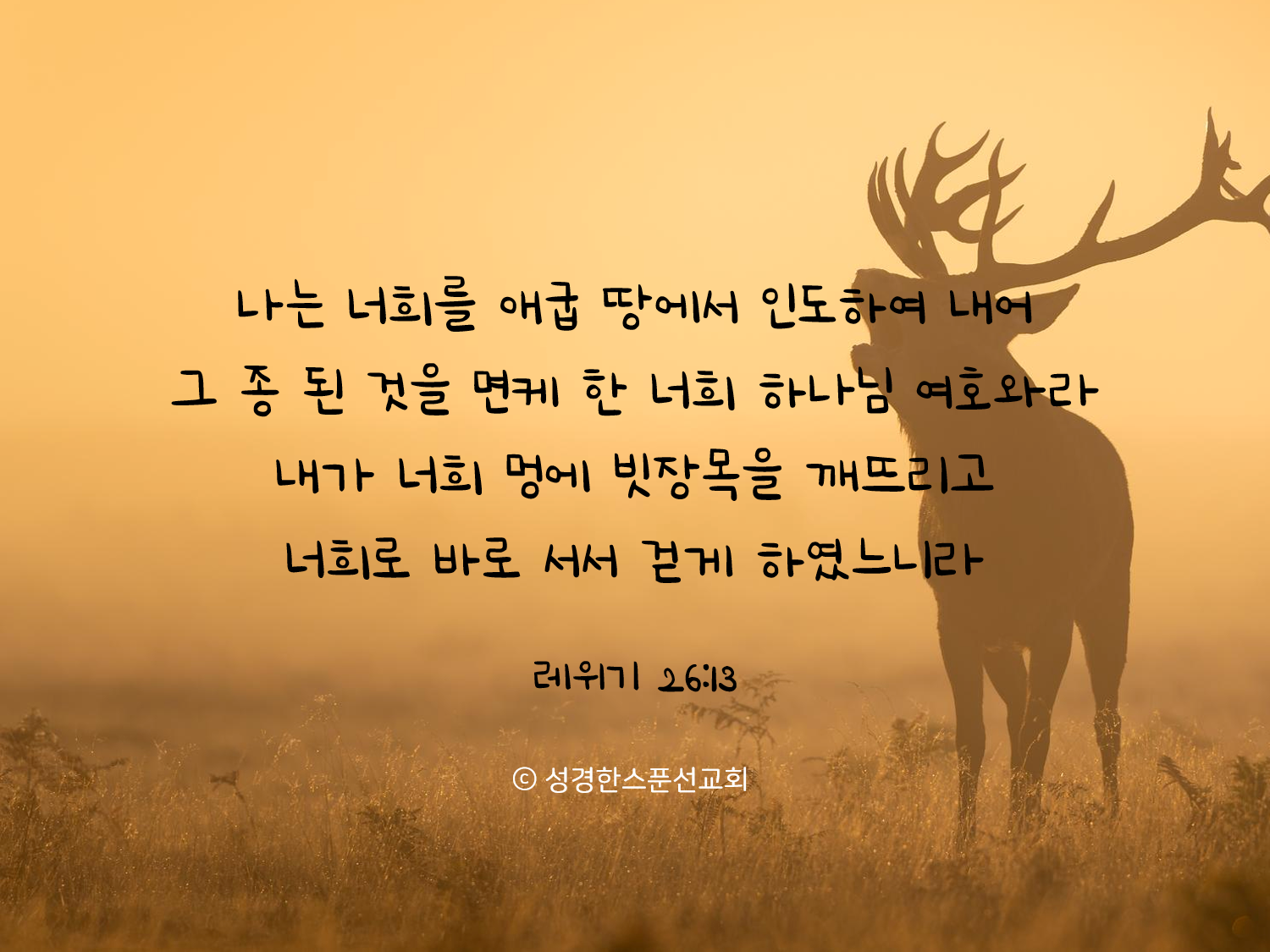 🔅오늘의 성경 한스푼/말씀카드 내가 너희 멍에 빗장목을 깨뜨리고 너희로 바로 서서 걷게 하였느니라 bibleonespoon 2022. 8. 17. 07:48 핸드폰 배경화면, SNS 프로필 사진, 암송카드 등 개인적인 용도로는 자유롭게 활용하셔도 좋습니다. (2-3초간 꾹 누르시면 이미지 저장이 가능합니다♡) 공유하기 게시글 관리 성경한스푼선교회 '🔅오늘의 성경 한스푼/말씀카드' Related Articles 너희가 그 땅에 거한 동안 너희 안식 시에 쉼을 얻지 못하던 땅이 그 황무할 동안에는 쉬리라 너희가 그렇게 되어도 내게 청종치 아니하면 너희 죄를 인하여 내가 너희를 칠배나 더 징치할지라 이는 내가 이스라엘 자손을 애굽 땅에서 인도하여 내던 때에 초막에 거하게 한 줄을 너희 대대로 알게 함이니라 너는 그것을 가난한 자와 객을 위하여 버려 두라