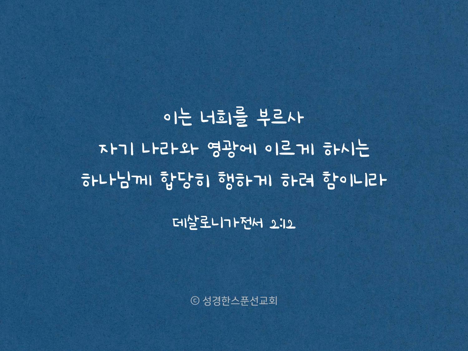 🔅오늘의 성경 한스푼/말씀카드 이는 너희를 부르사 자기 나라와 영광에 이르게 하시는 하나님께 합당히 행하게 하려 함이니라 bibleonespoon 2022. 8. 24. 07:34 핸드폰 배경화면, SNS 프로필 사진, 암송카드 등 개인적인 용도로는 자유롭게 활용하셔도 좋습니다. (2-3초간 꾹 누르시면 이미지 저장이 가능합니다♡) 공유하기 게시글 관리 성경한스푼선교회 '🔅오늘의 성경 한스푼/말씀카드' Related Articles 하나님의 뜻은 이것이니 너희의 거룩함이라 곧 음란을 버리고 너희도 피차간과 모든 사람에 대한 사랑이 더욱 많아 넘치게 하사 믿음의 역사와 사랑의 수고와 우리 주 예수 그리스도에 대한 소망의 인내 땅의 곡식이나 나무의 과실이나 그 십분 일은 여호와의 것이니