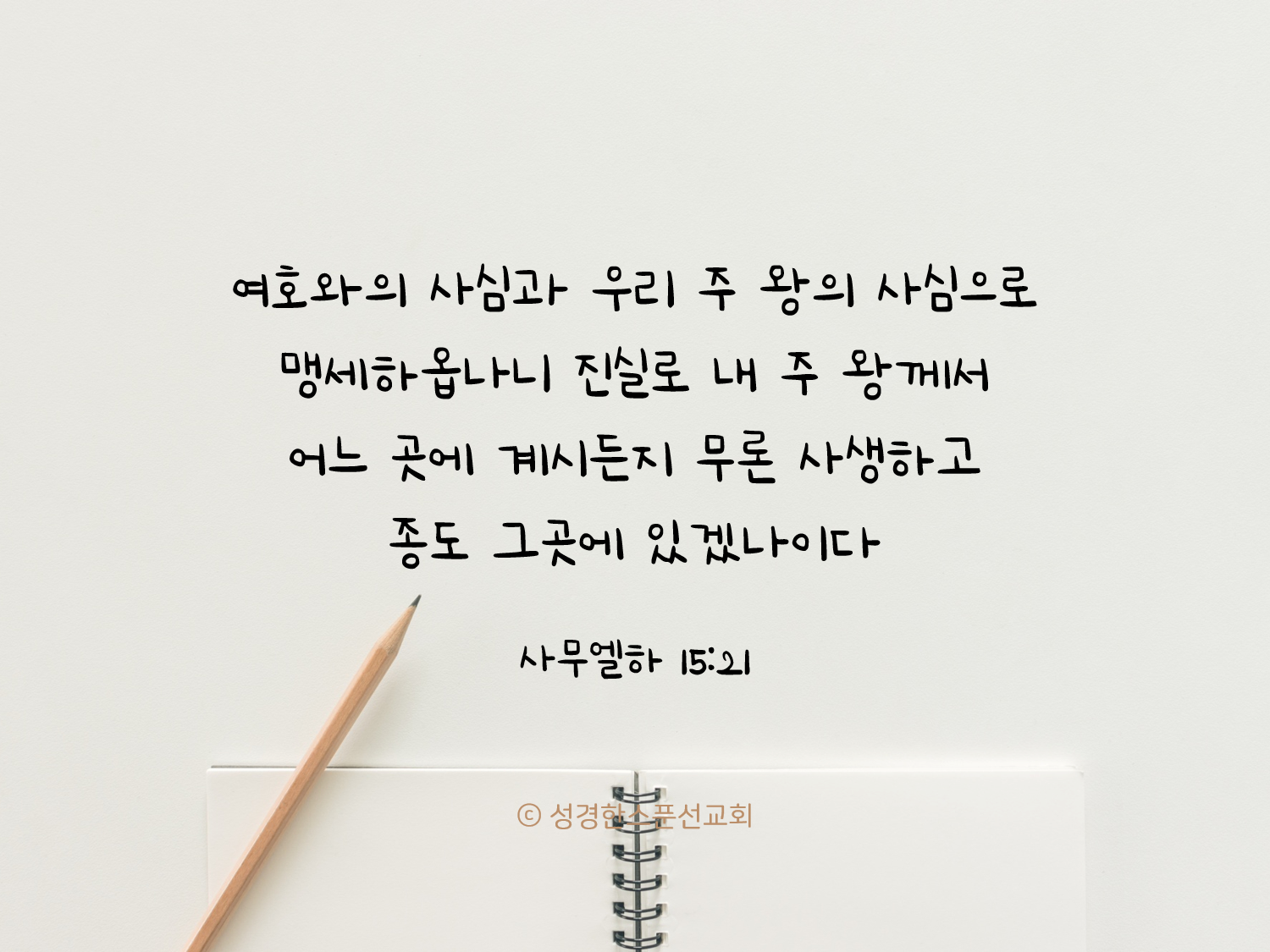 🔅오늘의 성경 한스푼/말씀카드 내 주 왕께서 어느 곳에 계시든지 무론 사생하고 종도 그곳에 있겠나이다 bibleonespoon 2022. 10. 13. 07:49 핸드폰 배경화면, SNS 프로필 사진, 암송카드 등 개인적인 용도로는 자유롭게 활용하셔도 좋습니다. (2-3초간 꾹 누르시면 이미지 저장이 가능합니다♡) 공유하기 게시글 관리 성경한스푼선교회 '🔅오늘의 성경 한스푼/말씀카드' Related Articles 너는 나의 사는 날 동안에 여호와의 인자를 내게 베풀어서 만일 내가 여호와 앞에서 은혜를 얻으면 도로 나를 인도하사 내가 이새의 아들 다윗을 만나니 내 마음에 합한 사람이라 만일 우리가 우리 죄를 자백하면 그는 미쁘시고 의로우사 우리 죄를 사하시며
