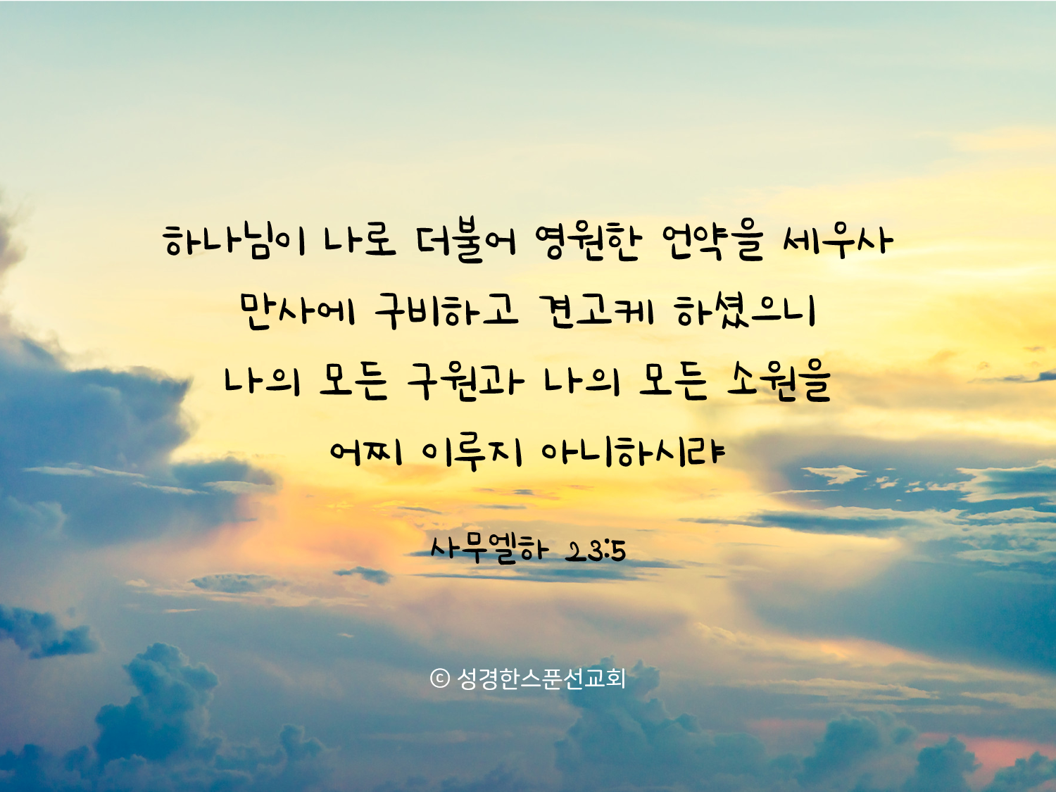 🔅오늘의 성경 한스푼/말씀카드 하나님이 나로 더불어 영원한 언약을 세우사 만사에 구비하고 견고케 하셨으니 bibleonespoon 2022. 10. 28. 08:35 핸드폰 배경화면, SNS 프로필 사진, 암송카드 등 개인적인 용도로는 자유롭게 활용하셔도 좋습니다. (2-3초간 꾹 누르시면 이미지 저장이 가능합니다♡) 공유하기 게시글 관리 성경한스푼선교회 '🔅오늘의 성경 한스푼/말씀카드' Related Articles 주께서 유다 왕 여호야김과 하나님의 전 그릇 얼마를 그의 손에 넘기시매 이에 여호와께서 그 땅을 위하여 기도를 들으시매 이스라엘에게 내리는 재앙이 그쳤더라 내가 주를 의뢰하고 적군에 달리며 내 하나님을 의지하고 성벽을 뛰어넘나이다 너는 나의 사는 날 동안에 여호와의 인자를 내게 베풀어서